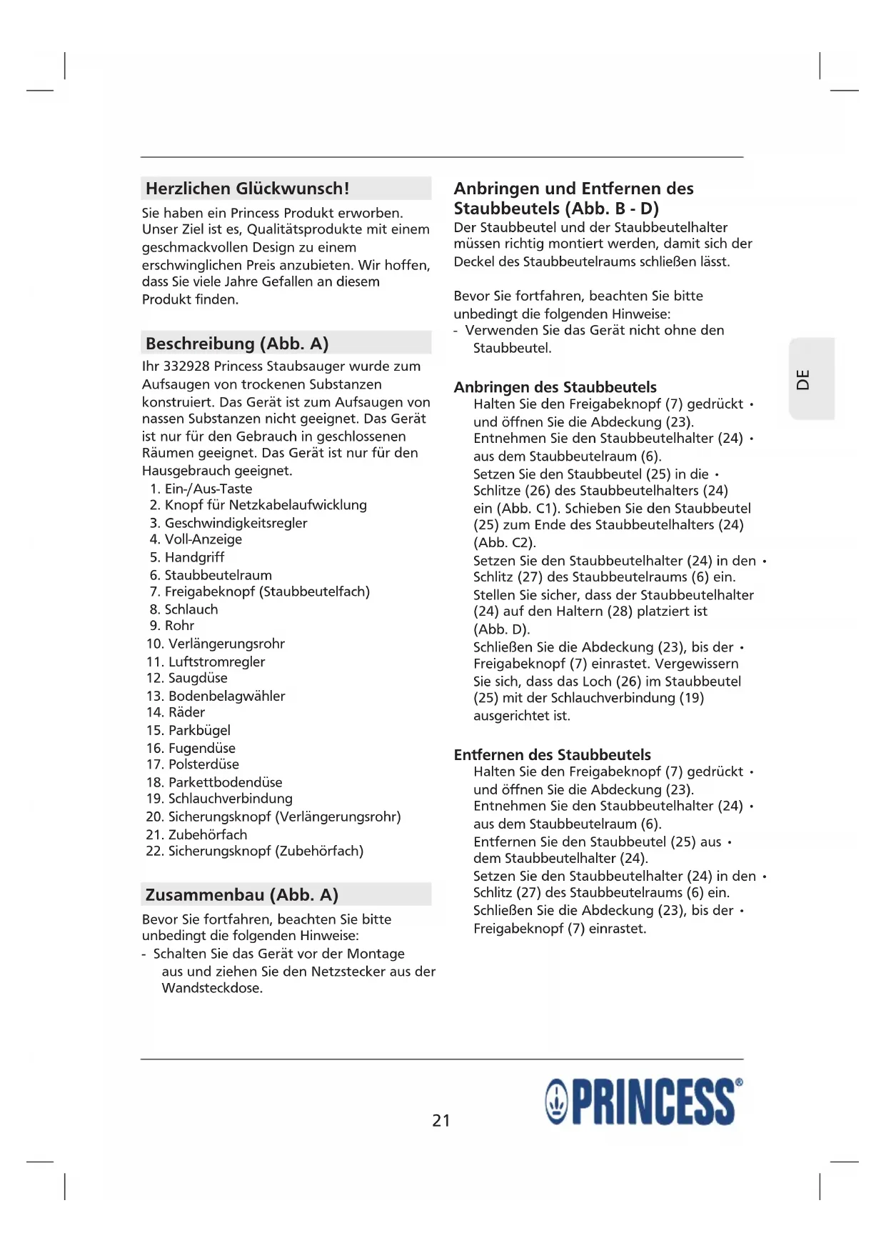 Herzlichen Glückwunsch! Sie haben ein Princess Produkt erworben. Unser Ziel ist es, Qualitätsprodukte mit einem geschmackvollen Design zu einem erschwinglichen Preis anzubieten. Wir hoffen, dass Sie viele Jahre Gefallen an diesem Produkt finden. Beschreibung (Abb. A) Ihr 332928 Princess Staubsauger wurde zum Aufsaugen von trockenen Substanzen konstruiert. Das Gerät ist zum Aufsaugen von nassen Substanzen nicht geeignet. Das Gerät ist nur für den Gebrauch in geschlossenen Räumen geeignet. Das Gerät ist nur für den Hausgebrauch geeignet.