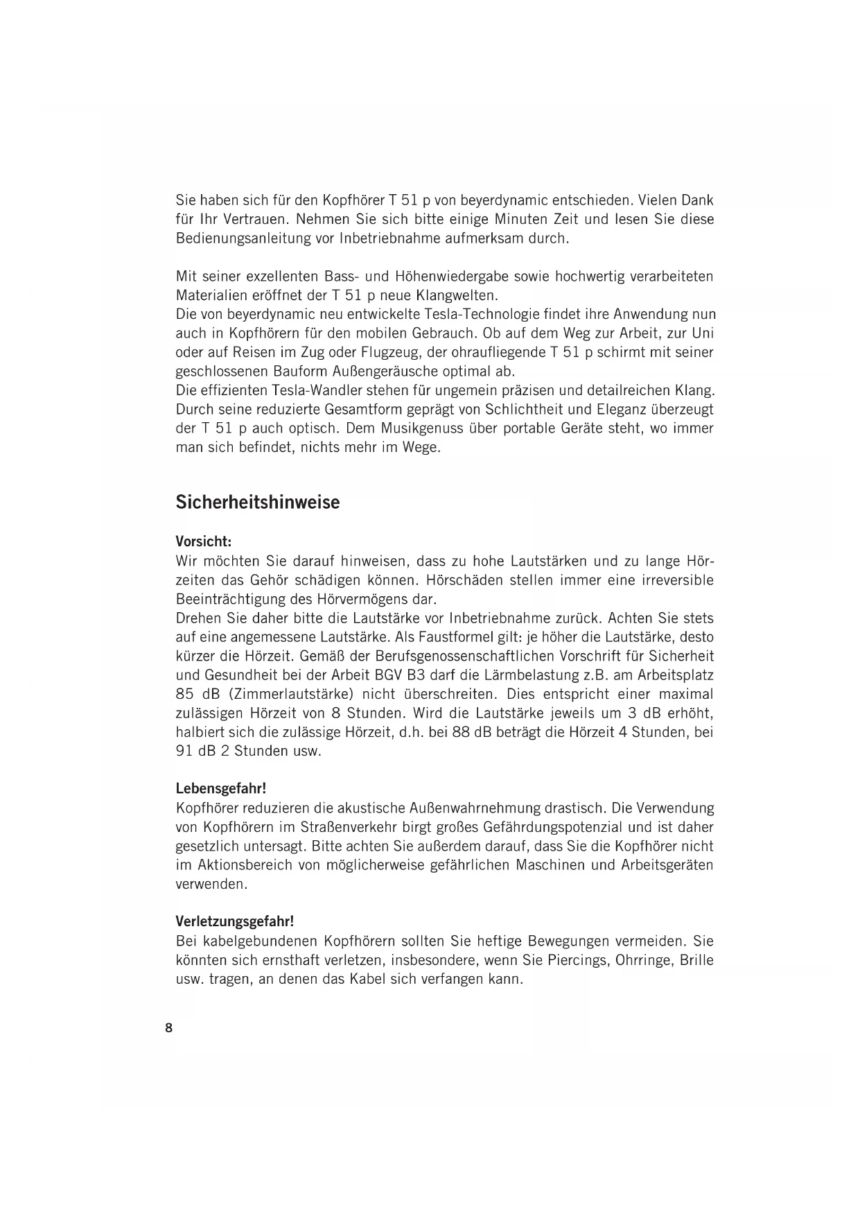 - Remove the protective foil from the new ear pad and apply it to the housing.8 Sie haben sich für den Kopfhörer T 51 p von beyerdynamic entschieden. Vielen Dank für Ihr Vertrauen. Nehmen Sie sich bitte einige Minuten Zeit und lesen Sie diese Bedienungsanleitung vor Inbetriebnahme aufmerksam durch. Mit seiner exzellenten Bass- und Höhenwiedergabe sowie hochwertig verarbeiteten Materialien eröffnet der T 51 p neue Klangwelten. Die von beyerdynamic neu entwickelte Tesla-Technologie findet ihre Anwendung nun auch in Kopfhörern für den mobilen Gebrauch. Ob auf dem Weg zur Arbeit, zur Uni oder auf Reisen im Zug oder Flugzeug, der ohraufliegende T 51 p schirmt mit seiner geschlossenen Bauform Außengeräusche optimal ab. Die effizienten Tesla-Wandler stehen für ungemein präzisen und detailreichen Klang. Durch seine reduzierte Gesamtform geprägt von Schlichtheit und Eleganz überzeugt der T 51 p auch optisch. Dem Musikgenuss über portable Geräte steht, wo immer man sich befindet, nichts mehr im Wege. Sicherheitshinweise Vorsicht: Wir möchten Sie darauf hinweisen, dass zu hohe Lautstärken und zu lange Hör- zeiten das Gehör schädigen können. Hörschäden stellen immer eine irreversible Beeinträchtigung des Hörvermögens dar. Drehen Sie daher bitte die Lautstärke vor Inbetriebnahme zurück. Achten Sie stets auf eine angemessene Lautstärke. Als Faustformel gilt: je höher die Lautstärke, desto kürzer die Hörzeit. Gemäß der Berufsgenossenschaftlichen Vorschrift für Sicherheit und Gesundheit bei der Arbeit BGV B3 darf die Lärmbelastung z.B. am Arbeitsplatz 85 dB (Zimmerlautstärke) nicht überschreiten. Dies entspricht einer maximal zulässigen Hörzeit von 8 Stunden. Wird die Lautstärke jeweils um 3 dB erhöht, halbiert sich die zulässige Hörzeit, d.h. bei 88 dB beträgt die Hörzeit 4 Stunden, bei 91 dB 2 Stunden usw. Lebensgefahr! Kopfhörer reduzieren die akustische Außenwahrnehmung drastisch. Die Verwendung von Kopfhörern im Straßenverkehr birgt großes Gefährdungspotenzial und ist daher gesetzlich untersagt. Bitte achten Sie außerdem darauf, dass Sie die Kopfhörer nicht im Aktionsbereich von möglicherweise gefährlichen Maschinen und Arbeitsgeräten verwenden. Verletzungsgefahr! Bei kabelgebundenen Kopfhörern sollten Sie heftige Bewegungen vermeiden. Sie könnten sich ernsthaft verletzen, insbesondere, wenn Sie Piercings, Ohrringe, Brille usw. tragen, an denen das Kabel sich verfangen kann.9 deutsch Einstellen des Kopfbügels Vor dem ersten Tragen sollten Sie die Passform des T 51 p optimal einstellen, um die beste Klangwiedergabe und Abschirmung von Außengeräuschen zu erzielen. Bitte beachten Sie folgende Hinweise: