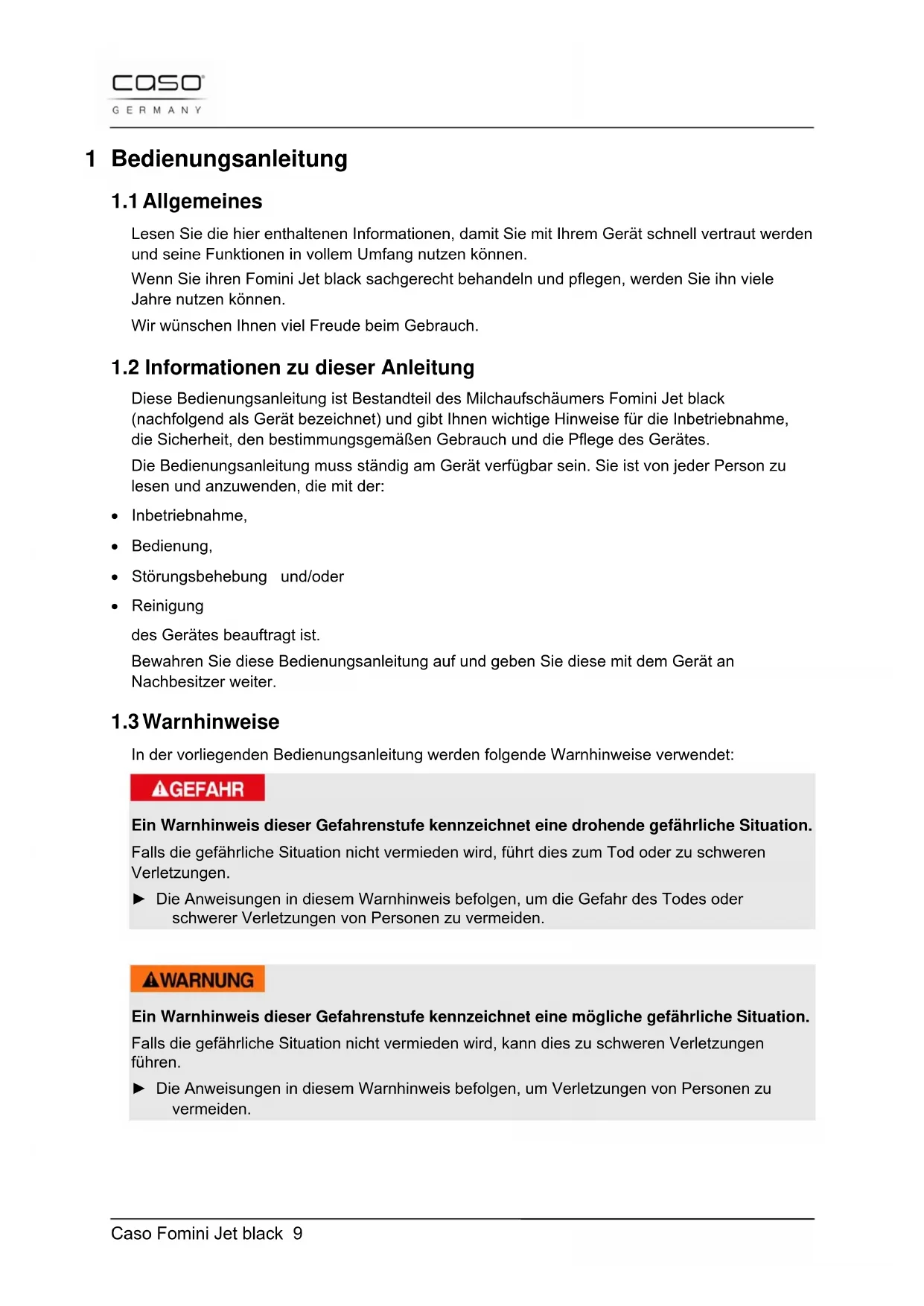 Beachten Sie für einen sicheren Umgang mit dem Gerät die folgenden allgemeinen Sicherheitshinweise: ► Kontrollieren Sie das Gerät vor der Verwendung auf äußere sichtbare Schäden. Nehmen Sie ein beschädigtes Gerät nicht in Betrieb. ► Bei Beschädigung der Anschlussleitung muss eine neue Anschlussleitung durch eine autorisierte Fachkraft installiert werden. ► Gestatten Sie Kindern die Benutzung des Gerätes nur unter Aufsicht. ► Kinder müssen beaufsichtigt werden! Lassen Sie Kinder nicht mit dem Gerät spielen. ► Das Gerät ist nicht für die Benutzung von Kindern und Personen mit eingeschränktem Sehvermögen oder geistigen oder körperlichen Behinderungen oder solchen mit mangelnden Erfahrungen oder Kenntnissen gedacht, es sei denn, sie werden dabei beaufsichtigt oder wurden vorher durch eine für ihre Sicherheit verantwortliche Person entsprechend unterwiesen.Caso Fomini Jet black 12 ► Dieses Gerät kann von Kindern ab 8 Jahren und darüber verwendet werden sowie von Personen mit eingeschränkten physischen, sensorischen oder geistigen Fähigkeiten oder mangelnder Erfahrung und Wissen, wenn Sie eine ausführliche Anleitung zur Benutzung des Gerätes erhalten haben und entsprechend beaufsichtig werden. ► Reinigung und Wartung sollte nur dann von Kindern durchgeführt werden, wenn sie älter als 8 sind und überwacht werden. Halten Sie das Gerät und seine Kabel außerhalb der Reichweite von Kindern unter 8 Jahren. ► Das Gerät während des Betriebes nicht unbeaufsichtigt lassen. ► Reparaturen dürfen nur von qualifiziertem Fachpersonal durchgeführt werden, die vom Hersteller geschult sind. Durch unsachgemäße Reparaturen können erhebliche Gefahren für den Benutzer entstehen. ► Eine Reparatur des Gerätes während der Garantiezeit darf nur von einem vom Hersteller autorisierten Kundendienst vorgenommen werden, sonst besteht bei nachfolgenden Schäden kein Garantieanspruch mehr. ► Defekte Bauteile dürfen nur gegen Original-Ersatzteile ausgetauscht werden. Nur bei diesen Teilen ist gewährleistet, dass sie die Sicherheitsanforderungen erfüllen werden. ► Verwenden Sie keine andere Flüssigkeit als Milch.
