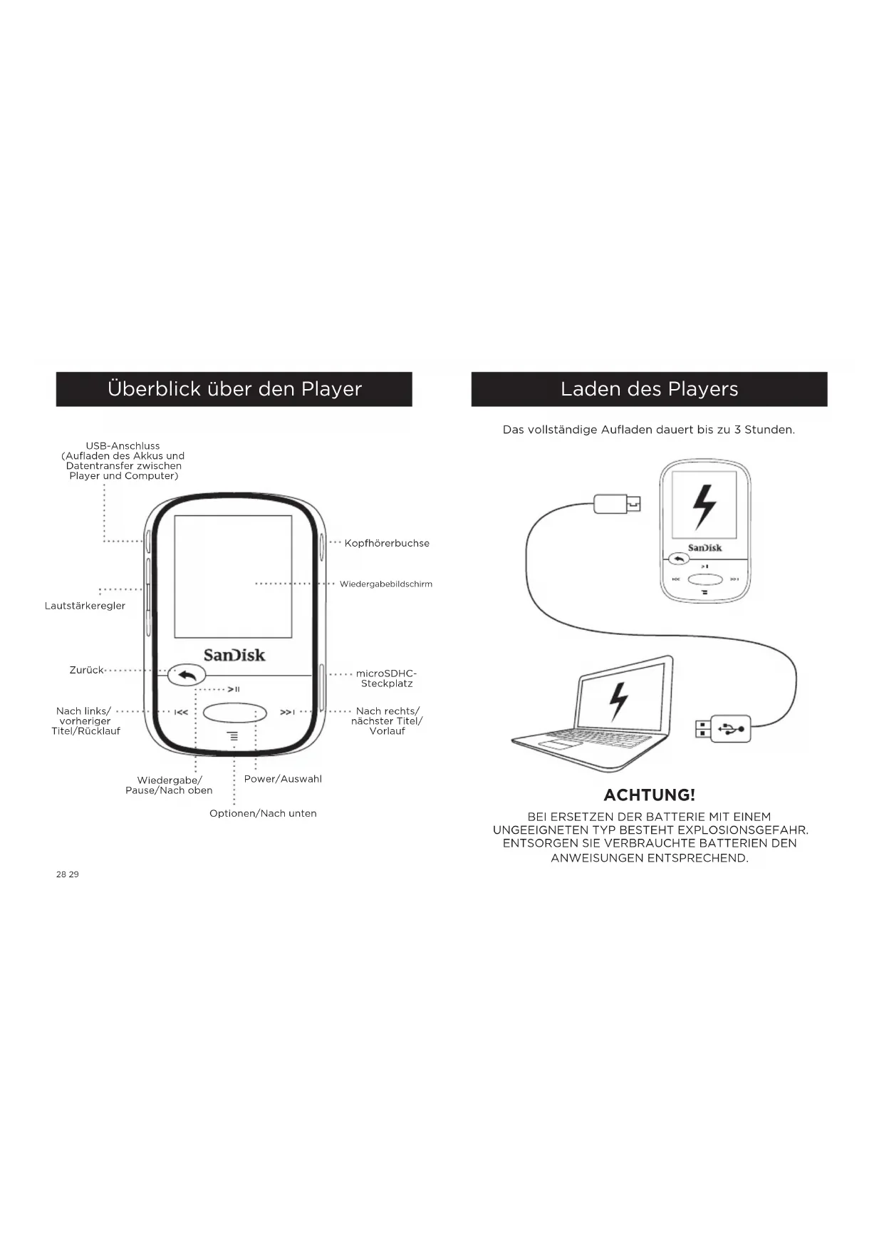 GESETZ NICHT ABLEHNEN ODER AUSSCHLIESSEN KÖNNEN, SIND DIESE STILLSCHWEIGENDEN GARANTIEN IM GESETZLICH ZULÄSSIGEN RAHMEN AUF DIE GELTUNGSDAUER DER AUSDRÜCKLICHEN GARANTIE BESCHRÄNKT. DIE FÜR EIN ERSATZPRODUKT GELTENDE GARANTIE ENTSPRICHT DABEI DER AUF DAS ORIGINALPRODUKT VERBLEIBENDEN GARANTIEZEIT. Unter den Bundes-, Landes- oder lokalen Gesetzen stehen Ihnen möglicherweise andere Rechte zu, die durch diese Garantie nicht beeinträchtigt werden.38 Italiano Guida rapida Istruzioni per la sicurezza Garanzia Contratto con l’utente finale Italiano SanDisk ist eine in den Vereinigten Staaten und anderen Ländern eingetragene Marke der SanDisk Corporation. Die microSD- und microSDHC-Marken sind Marken von SD-3C, LLC. Alle anderen Marken sind Eigentum ihrer jeweiligen Inhaber.© 2014 SanDisk Corporation. Alle Rechte vorbehalten. Hergestellt in China. Endbenutzer-Lizenzvertrag FCC-BESTIMMUNGEN Dieses Gerät erfüllt die in Abschnitt 15 der Bestimmungen der Federal Communications Commission (FCC) festgelegten Bestimmungen. Der Betrieb unterliegt den beiden folgenden Bedingungen:1. Dieses Gerät darf keine schädlichen Störungen verursachen.2. Dieses Gerät muss resistent gegen alle Störungen von außen sein, einschließlich der Störungen, die unerwünschte Betriebszustände verursachen könnten.Dieses Gerät entspricht laut Tests den Grenzwerten, die für digitale Geräte der Klasse B in Abschnitt 15 der Bestimmungen der Federal Communications Commission (FCC) festgelegt sind. Diese Grenzwerte sind dazu vorgesehen, in Wohngegenden angemessenen Schutz gegen Störungen sicherzustellen. Das Gerät erzeugt und verwendet hochfrequente Schwingungen und kann diese ausstrahlen. Wenn es nicht gemäß den Anweisungen des Herstellers installiert und betrieben wird, können Störungen im Radio- und Fernsehempfang auftreten. Es gibt jedoch keine Garantie, dass in einer bestimmten Installation keinerlei Störungen auftreten. Sollte der Radio- und Fernsehempfang beeinträchtigt sein, was durch Ein- und Ausschalten des Produkts festgestellt werden kann, empfiehlt sich die Behebung der Störung durch eine oder mehrere der folgenden Maßnahmen:1. Vergrößern Sie den Abstand zwischen Gerät und Empfänger.2. Schließen Sie das Gerät an eine andere Steckdose an, sodass das Gerät und der Empfänger jeweils einen anderen Stromkreis verwenden.3. Bitten Sie Ihren Händler oder einen erfahrenen Radio- bzw. Fernsehtechniker um Hilfe. http://mp3support.sandisk.com/smm/en-smm-eula.pdf40 41 Lettore - Descrizione generale Porta di connessione USB (ricarica e trasferimento verso/ dal computer) Controllo volume Indietro Sinistra/ Precedente/ Riavvolgimento Display Slot microSDHC Destra/ Successivo/ Avanzamento Power/Seleziona Opzioni/Scorrimento verso il basso Play/Pausa/ Scorrimento verso l’alto Presa auricolari Ricaricare il lettore Per la carica completa sono necessarie fino a tre ore. ATTENZIONE RISCHIO DI ESPLOSIONE SE LA BATTERIA VIENE SOSTITUITA CON UN TIPO NON CORRETTO DI BATTERIA. SMALTIRE LE BATTERIE USATE SECONDO LE ISTRUZIONI.42 43 Herunterladen von Dateien Utenti Windows