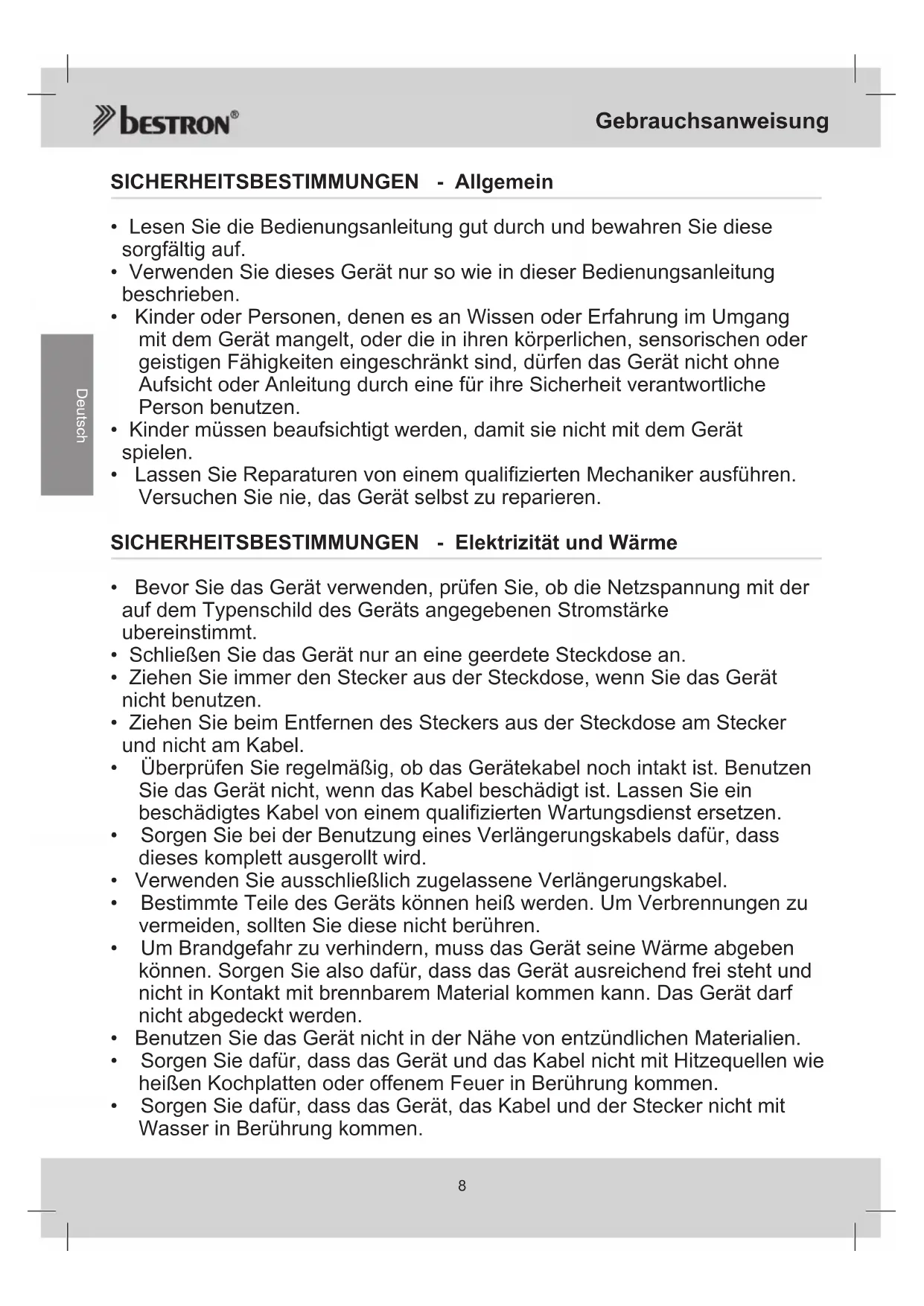 KUNDENDIENST Sollte unerwartet eine Störung auftreten dann können Sie sich mit dem BESTRON-Kundendienst in Verbindung setzen: DEUTSCHLAND: