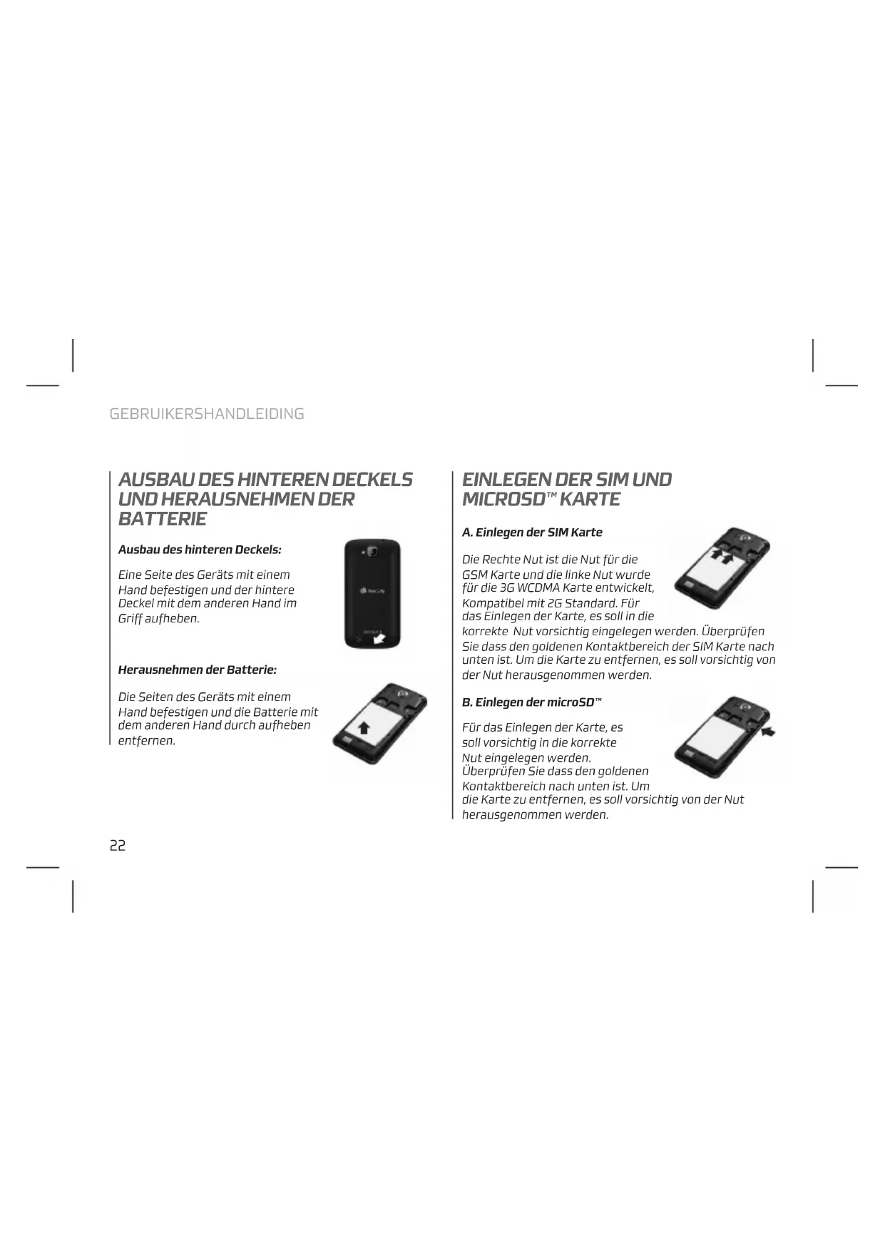 AUSBAU DES HINTEREN DECKELS UND HERAUSNEHMEN DER BATTERIE EINLEGEN DER SIM UND MICROSD™ KARTE Ausbau des hinteren Deckels: