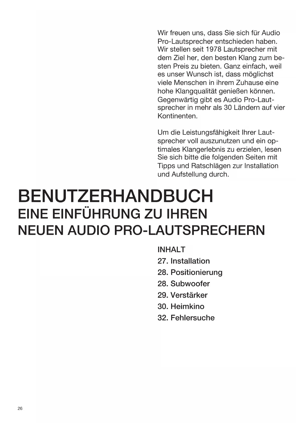 ance. Vérifiez le raccordement des câbles et le bon choix de la source audio. Inversez les branchements du câblage des enceintes gauche et droite. Si les enceintes restent silencieuses, il y a un problème. Dans le cas contraire, le problème vient d’ailleurs. Vérifiez que les câbles + et – sont branchés de façon identique et cor- recte aux enceintes ET à l’amplificateur. Vérifiez l’impédance néces- saire pour l’amplificateur. Vérifiez également le bon état des câbles et s’ils ne sont pas court-circuités. Symptôme Aucun son ne provient des enceintes. Le son ne provient que d’une enceinte. Mauvaise qualité des graves et/ou effet stéréo diffus. L’amplificateur se coupe inopinément.2526 Wir freuen uns, dass Sie sich für Audio Pro-Lautsprecher entschieden haben. Wir stellen seit 1978 Lautsprecher mit dem Ziel her, den besten Klang zum be- sten Preis zu bieten. Ganz einfach, weil es unser Wunsch ist, dass möglichst viele Menschen in ihrem Zuhause eine hohe Klangqualität genießen können. Gegenwärtig gibt es Audio Pro-Laut- sprecher in mehr als 30 Ländern auf vier Kontinenten. Um die Leistungsfähigkeit Ihrer Laut- sprecher voll auszunutzen und ein op- timales Klangerlebnis zu erzielen, lesen Sie sich bitte die folgenden Seiten mit Tipps und Ratschlägen zur Installation und Aufstellung durch. INHALT