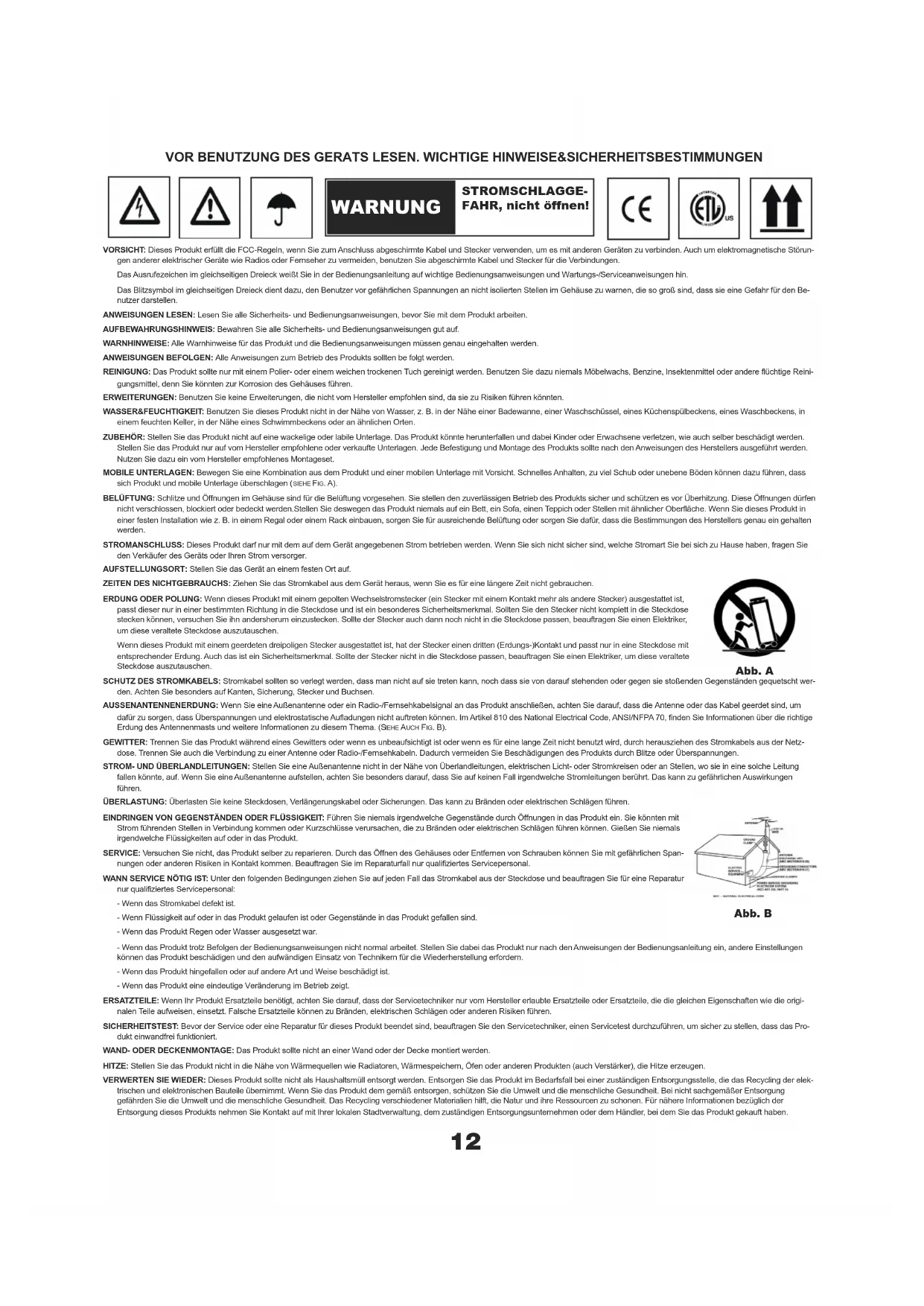einer festen Installation wie z. B. in einem Regal oder einem Rack einbauen, sorgen Sie für ausreichende Belüftung oder sorgen Sie dafür, dass die Bestimmungen des Herstellers genau ein ge halten werden. STROMANSCHLUSS: Dieses Produkt darf nur mit dem auf dem Gerät angegebenen Strom betrieben werden. Wenn Sie sich nicht sicher sind, welche Stromart Sie bei sich zu Hause haben, fragen Sie den Verkäufer des Geräts oder Ihren Strom versorger.AUFSTELLUNGSORT: Stellen Sie das Gerät an einem festen Ort auf. ZEITEN DES NICHTGEBRAUCHS: Ziehen Sie das Stromkabel aus dem Gerät heraus, wenn Sie es für eine längere Zeit nicht gebrauchen.