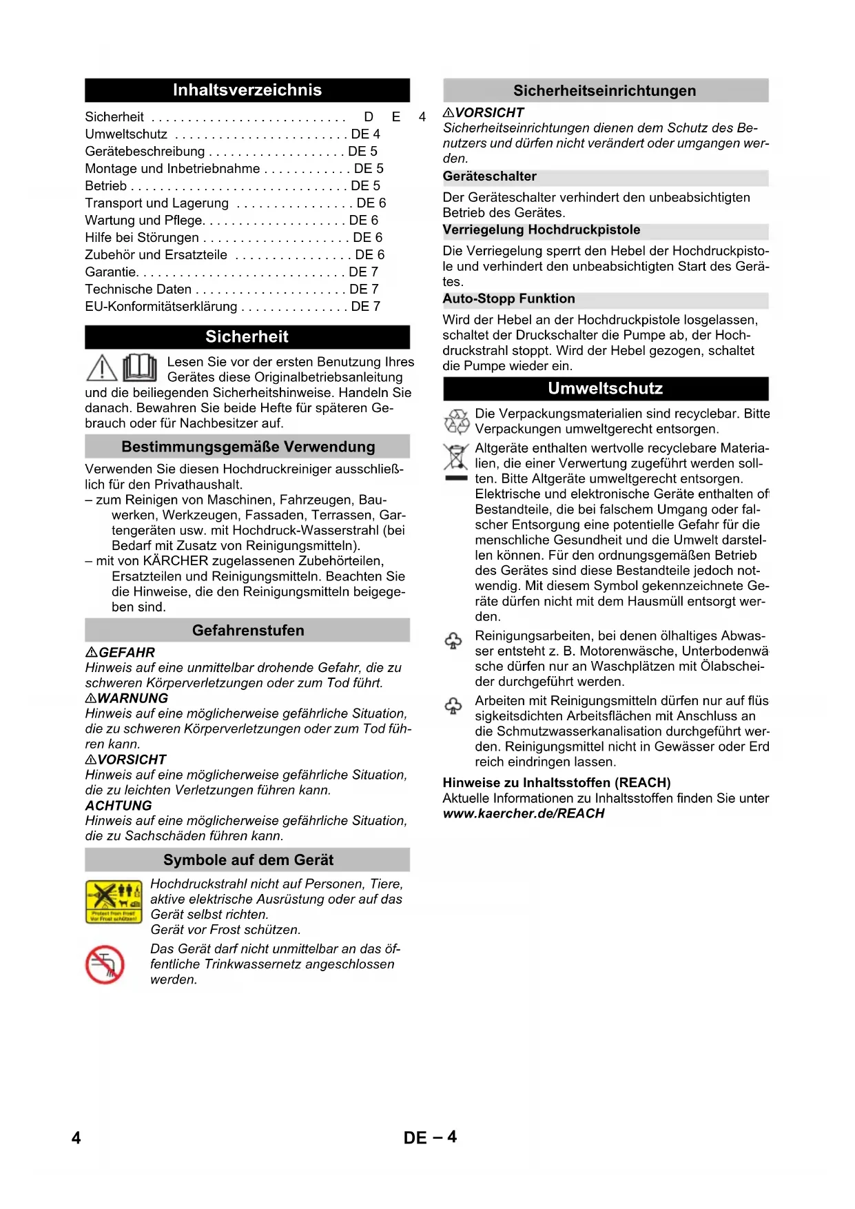 G H I J K L M N O– 4 Lesen Sie vor der ersten Benutzung Ihres Gerätes diese Originalbetriebsanleitung und die beiliegenden Sicherheitshinweise. Handeln Sie danach. Bewahren Sie beide Hefte für späteren Ge- brauch oder für Nachbesitzer auf. Verwenden Sie diesen Hochdruckreiniger ausschließ- lich für den Privathaushalt. – zum Reinigen von Maschinen, Fahrzeugen, Bau- werken, Werkzeugen, Fassaden, Terrassen, Gar- tengeräten usw. mit Hochdruck-Wasserstrahl (bei Bedarf mit Zusatz von Reinigungsmitteln). – mit von KÄRCHER zugelassenen Zubehörteilen, Ersatzteilen und Reinigungsmitteln. Beachten Sie die Hinweise, die den Reinigungsmitteln beigege- ben sind. GEFAHR Hinweis auf eine unmittelbar drohende Gefahr, die zu schweren Körperverletzungen oder zum Tod führt. 몇 WARNUNG Hinweis auf eine möglicherweise gefährliche Situation, die zu schweren Körperverletzungen oder zum Tod füh- ren kann. 몇 VORSICHT Hinweis auf eine möglicherweise gefährliche Situation, die zu leichten Verletzungen führen kann. ACHTUNG Hinweis auf eine möglicherweise gefährliche Situation, die zu Sachschäden führen kann. 몇 VORSICHT Sicherheitseinrichtungen dienen dem Schutz des Be- nutzers und dürfen nicht verändert oder umgangen wer- den. Der Geräteschalter verhindert den unbeabsichtigten Betrieb des Gerätes. Die Verriegelung sperrt den Hebel der Hochdruckpisto- le und verhindert den unbeabsichtigten Start des Gerä- tes. Wird der Hebel an der Hochdruckpistole losgelassen, schaltet der Druckschalter die Pumpe ab, der Hoch- druckstrahl stoppt. Wird der Hebel gezogen, schaltet die Pumpe wieder ein. Hinweise zu Inhaltsstoffen (REACH) Aktuelle Informationen zu Inhaltsstoffen finden Sie unter: www.kaercher.de/REACH Inhaltsverzeichnis Sicherheit ...DE4 Umweltschutz ... DE 4 Gerätebeschreibung ... DE 5 Montage und Inbetriebnahme ... DE 5 Betrieb ... DE 5 Transport und Lagerung ... DE 6 Wartung und Pflege... DE 6 Hilfe bei Störungen ... DE 6 Zubehör und Ersatzteile ... DE 6 Garantie... DE 7 Technische Daten ... DE 7 EU-Konformitätserklärung ... DE 7 Sicherheit Bestimmungsgemäße Verwendung Gefahrenstufen Symbole auf dem Gerät Hochdruckstrahl nicht auf Personen, Tiere, aktive elektrische Ausrüstung oder auf das Gerät selbst richten. Gerät vor Frost schützen. Das Gerät darf nicht unmittelbar an das öf- fentliche Trinkwassernetz angeschlossen werden. Sicherheitseinrichtungen Geräteschalter Verriegelung Hochdruckpistole Auto-Stopp Funktion Umweltschutz Die Verpackungsmaterialien sind recyclebar. Bitte Verpackungen umweltgerecht entsorgen. Altgeräte enthalten wertvolle recyclebare Materia- lien, die einer Verwertung zugeführt werden soll- ten. Bitte Altgeräte umweltgerecht entsorgen. Elektrische und elektronische Geräte enthalten oft Bestandteile, die bei falschem Umgang oder fal- scher Entsorgung eine potentielle Gefahr für die menschliche Gesundheit und die Umwelt darstel- len können. Für den ordnungsgemäßen Betrieb des Gerätes sind diese Bestandteile jedoch not- wendig. Mit diesem Symbol gekennzeichnete Ge- räte dürfen nicht mit dem Hausmüll entsorgt wer- den. Reinigungsarbeiten, bei denen ölhaltiges Abwas- ser entsteht z. B. Motorenwäsche, Unterbodenwä- sche dürfen nur an Waschplätzen mit Ölabschei- der durchgeführt werden. Arbeiten mit Reinigungsmitteln dürfen nur auf flüs- sigkeitsdichten Arbeitsflächen mit Anschluss an die Schmutzwasserkanalisation durchgeführt wer- den. Reinigungsmittel nicht in Gewässer oder Erd- reich eindringen lassen. 4 DE– 5 Der Lieferumfang des Gerätes (Modell abhängig) wird auf der Verpackung abgebildet. Diese Betriebsanlei- tung beschreibt alle möglichen Optionen. Abbildungen siehe Grafikseiten 1 Hochdruckanschluss 2 Geräteschalter „0/OFF“ / „I/ON“ 3 Aufbewahrung für Hochdruckschlauch 4 Tragegriff 5 Aufbewahrung für Strahlrohr 6 Wasseranschluss mit eingebautem Sieb 7 Kupplung für Wasseranschluss 8 Netzanschlussleitung mit Netzstecker 9 Typenschild 10 Hochdruckpistole 11 Verriegelung Hochdruckpistole 12 Hochdruckschlauch 13 Klammer für Hochdruckschlauch 14 Strahlrohr mit Hochdruckdüse Für normale Reinigungsaufgaben. 15 Strahlrohr mit Dreckfräser Für hartnäckige Verschmutzungen. Abbildungen siehe Grafikseiten Abbildung Dem Gerät lose beigelegte Teile vor Inbetriebnah- me montieren. Gerät auf eine ebene Fläche stellen. Abbildung Klammer aus Hochdruckpistole herausziehen und Hochdruckschlauch in Hochdruckpistole stecken. Klammer eindrücken, bis sie einrastet. Sichere Verbindung durch Ziehen am Hochdruckschlauch prüfen. Abbildung ACHTUNG Verunreinigungen im Wasser können die Hochdruck- pumpe und das Zubehör beschädigen. Zum Schutz wird die Verwendung des KÄRCHER-Wasserfilters (Sonder- zubehör, Bestellnummer 4.730-059) empfohlen. 몇 VORSICHT Trockenlauf von mehr als 2 Minuten führt zu Beschädi- gungen an der Hochdruckpumpe. Baut das Gerät inner- halb von 2 Minuten keinen Druck auf, Gerät abschalten und gemäß Hinweisen im Kapitel „Hilfe bei Störungen“ verfahren. 몇 VORSICHT Mindestens 30 cm Strahlabstand bei der Reinigung von lackierten Oberflächen einhalten, um Beschädigungen zu vermeiden. ACHTUNG Autoreifen, Lack oder empfindliche Oberflächen wie Holz nicht mit dem Dreckfräser reinigen, Gefahr der Be- schädigung. Abbildung ACHTUNG Gefahr von Lackschäden Bei Arbeiten mit der Waschbürste muss diese frei von Schmutz- oder sonstigen Partikeln sein. Hinweis: Bei Bedarf können auch die Waschbürsten zum Arbeiten mit Reinigungsmittel verwendet werden. Hinweis: Reinigungsmittel kann nur im Niederdruck zu- gemischt werden. Optional Abbildung Abbildung Reinigungsmittel sparsam auf die trockene Ober- fläche sprühen und einwirken (nicht trocknen) las- sen. Gelösten Schmutz mit Hochdruckstrahl abspülen. Nach Arbeiten mit Reinigungsmittel: Gerät etwa 1 Minute zum klarspülen betreiben. Abbildung Hebel der Hochdruckpistole loslassen und verrie- geln. Bei längeren Arbeitspausen (über 5 Minuten)