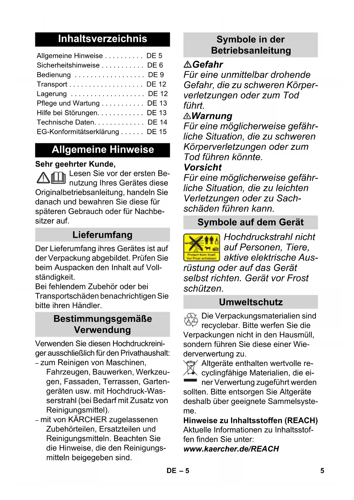 www.kaercher.com/register-and-win 59662910 (09/13) K 3 Deutsch 5 English 16 Français 27 Italiano 39 Nederlands 50 Español 61 Português 73 Dansk 85 Norsk 96 Svenska 107 Suomi 118 Ελληνικά 129 Türkçe 142 Русский 153 Magyar 166 Čeština 177 Slovenščina 188 Polski 198 Româneşte 210 Slovenčina 221 Hrvatski 232 Srpski 242 Български 253 Eesti 265 Latviešu 275 Lietuviškai 286 Українська 297 001234– 5 Sehr geehrter Kunde, Lesen Sie vor der ersten Be- nutzung Ihres Gerätes diese Originalbetriebsanleitung, handeln Sie danach und bewahren Sie diese für späteren Gebrauch oder für Nachbe- sitzer auf. Der Lieferumfang ihres Gerätes ist auf der Verpackung abgebildet. Prüfen Sie beim Auspacken den Inhalt auf Voll- ständigkeit. Bei fehlendem Zubehör oder bei Transportschäden benachrichtigen Sie bitte ihren Händler. Verwenden Sie diesen Hochdruckreini- ger ausschließlich für den Privathaushalt: – zum Reinigen von Maschinen, Fahrzeugen, Bauwerken, Werkzeu- gen, Fassaden, Terrassen, Garten- geräten usw. mit Hochdruck-Was- serstrahl (bei Bedarf mit Zusatz von Reinigungsmittel). – mit von KÄRCHER zugelassenen Zubehörteilen, Ersatzteilen und Reinigungsmitteln. Beachten Sie die Hinweise, die den Reinigungs- mitteln beigegeben sind. Gefahr Für eine unmittelbar drohende Gefahr, die zu schweren Körper- verletzungen oder zum Tod führt. 몇 Warnung Für eine möglicherweise gefähr- liche Situation, die zu schweren Körperverletzungen oder zum Tod führen könnte. Vorsicht Für eine möglicherweise gefähr- liche Situation, die zu leichten Verletzungen oder zu Sach- schäden führen kann. Hochdruckstrahl nicht auf Personen, Tiere, aktive elektrische Aus- rüstung oder auf das Gerät selbst richten. Gerät vor Frost schützen. Die Verpackungsmaterialien sind recyclebar. Bitte werfen Sie die Verpackungen nicht in den Hausmüll, sondern führen Sie diese einer Wie- derverwertung zu. Altgeräte enthalten wertvolle re- cyclingfähige Materialien, die ei- ner Verwertung zugeführt werden sollten. Bitte entsorgen Sie Altgeräte deshalb über geeignete Sammelsyste- me. Hinweise zu Inhaltsstoffen (REACH) Aktuelle Informationen zu Inhaltsstof- fen finden Sie unter: www.kaercher.de/REACH Inhaltsverzeichnis Allgemeine Hinweise ... DE 5 Sicherheitshinweise ... DE 6 Bedienung ... DE 9 Transport ... DE 12 Lagerung ... DE 12 Pflege und Wartung ... DE 13 Hilfe bei Störungen... DE 13 Technische Daten... DE 14 EG-Konformitätserklärung ... DE 15 Allgemeine Hinweise Lieferumfang Bestimmungsgemäße Verwendung Symbole in der Betriebsanleitung Symbole auf dem Gerät Umweltschutz 5DE– 6 In jedem Land gelten die von unserer zuständigen Vertriebsgesellschaft her- ausgegebenen Garantiebedingungen. Etwaige Störungen an Ihrem Gerät be- seitigen wir innerhalb der Garantiefrist kostenlos, sofern ein Material- oder Herstellungsfehler die Ursache sein sollte. Im Garantiefall wenden Sie sich bitte mit Kaufbeleg an Ihren Händler oder die nächste autorisierte Kunden- dienststelle. (Adresse siehe Rückseite) Gefahr Netzstecker und Steckdose niemals mit feuchten Händen anfassen. Das Gerät nicht in Betrieb setzen, wenn die Netzan- schlussleitung oder wichtige Teile des Gerätes, z.B. Hoch- druckschlauch, Handspritz- pistole oder Sicherheitsein- richtungen beschädigt sind. Netzanschlussleitung mit Netzstecker vor jedem Be- trieb auf Schäden prüfen. Be- schädigte Netzanschlusslei- tung unverzüglich durch auto- risierten Kundendienst/Elekt- ro-Fachkraft austauschen lassen. Hochdruckschlauch vor je- dem Betrieb auf Schäden prüfen. Beschädigten Hoch- druckschlauch unverzüglich austauschen. Der Betrieb in explosionsge- fährdeten Bereichen ist unter- sagt. Beim Einsatz des Gerätes in Gefahrbereichen (z.B. Tank- stellen) sind die entsprechen- den Sicherheitsvorschriften zu beachten. Hochdruckstrahlen können bei unsachgemäßem Ge- brauch gefährlich sein. Der Strahl darf nicht auf Perso- nen, Tiere, aktive elektrische Ausrüstung oder auf das Ge- rät selbst gerichtet werden. Den Hochdruckstrahl nicht auf andere oder sich selbst richten, um Kleidung oder Schuhwerk zu reinigen. Keine Gegenstände absprit- zen, die gesundheitsgefähr- dende Stoffe (z.B. Asbest) enthalten. Fahrzeugreifen/Reifenventile können durch den Hoch- druckstrahl beschädigt wer- den und platzen. Erstes An- zeichen hierfür ist eine Ver- färbung des Reifens. Beschä- digte Fahrzeugreifen/Reifen- ventile sind lebensgefährlich. Mindestens 30 cm Strahlab- stand bei der Reinigung ein- halten! Explosionsgefahr! Keine brennbaren Flüssigkei- ten versprühen. Niemals lösungsmittelhaltige Flüssigkeiten oder unver- dünnte Säuren und Lösungs- mittel ansaugen! Dazu zählen z.B. Benzin, Farbverdünner oder Heizöl. Der Sprühnebel ist hochentzündlich, explosiv Garantie Sicherheitshinweise 6 DE– 7 und giftig. Kein Aceton, un- verdünnte Säuren und Lö- sungsmittel verwenden, da sie die am Gerät verwende- ten Materialien angreifen. 몇 Warnung Netzstecker und Kupplung ei- ner Verlängerungsleitung müssen wasserdicht sein und dürfen nicht im Wasser liegen. Die Kupplung darf weiterhin nicht auf dem Boden liegen. Es wird empfohlen, Kabel- trommeln zu verwenden, die gewährleisten, dass die Steck- dosen sich mindestens 60 mm über dem Boden befinden. Ungeeignete elektrische Ver- längerungsleitungen können gefährlich sein. Verwenden Sie im Freien nur dafür zuge- lassene und entsprechend ge- kennzeichnete elektrische Verlängerungsleitungen mit ausreichendem Leitungsquer- schnitt: 1 - 10 m: 1,5 mm