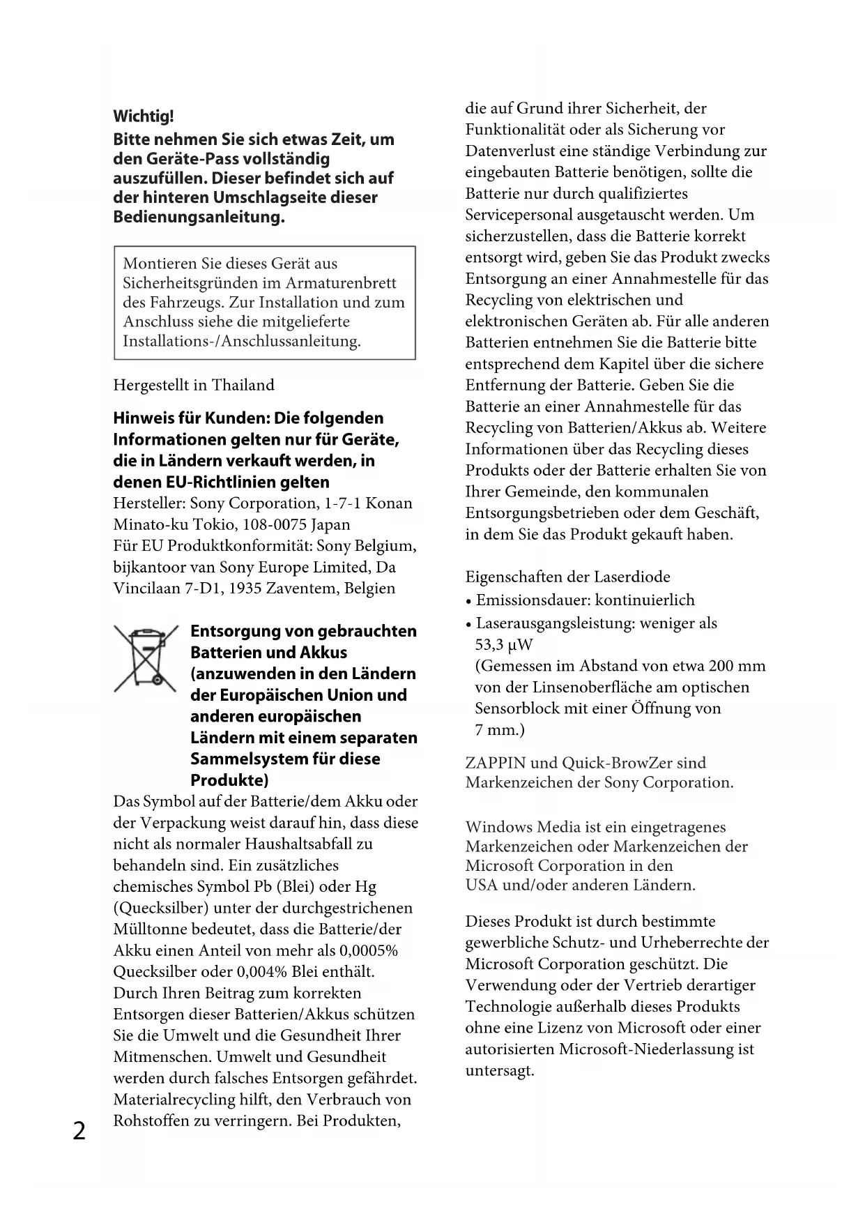 Hersteller: Sony Corporation, 1-7-1 Konan