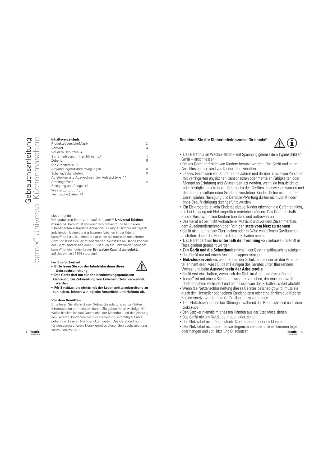 Universal-Küchenmaschine Inhaltsverzeichnis Produkteübersicht/Matrix 2 Vorwort 4 Vor dem Benutzen 4 Sicherheitsvorschriften für bamix