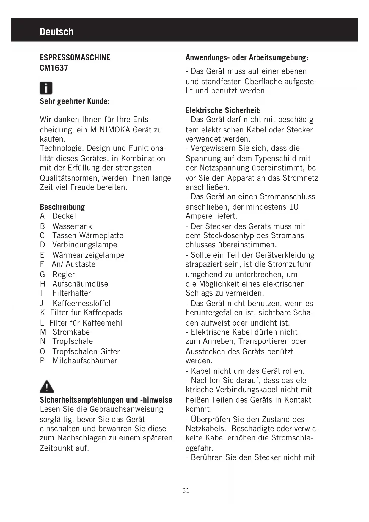 concentrations de substances con- sidérées comme étant nocives pour l’environnement. Ce symbole signifie que si vous souhaitez vous défaire du produit, une fois que celui-ci n’est plus utilisable, remettez-le, suivant la méthode appropriée, à un gestionnaire de déchets d’équipements électriques et électroniques (DEEE). Cet appareil est conforme à la direc- tive 2006/95/EC de basse tension ainsi qu’à la directive 2004/108/EC de compatibilité électromagnétique. 0DQXDO0LQLPRNDLQGE 30Deutsch ESPRESSOMASCHINE CM1637 Sehr geehrter Kunde: Wir danken Ihnen für Ihre Ents- cheidung, ein MINIMOKA Gerät zu kaufen. Technologie, Design und Funktiona- lität dieses Gerätes, in Kombination mit der Erfüllung der strengsten Qualitätsnormen, werden Ihnen lange Zeit viel Freude bereiten. Beschreibung A Deckel B Wassertank C Tassen-Wärmeplatte D Verbindungslampe E Wärmeanzeigelampe F An/ Austaste G Regler H Aufschäumdüse I Filterhalter J Kaffeemesslöffel K Filter für Kaffeepads L Filter für Kaffeemehl M Stromkabel N Tropfschale O Tropfschalen-Gitter P Milchaufschäumer Sicherheitsempfehlungen und -hinweise Lesen Sie die Gebrauchsanweisung sorgfältig, bevor Sie das Gerät einschalten und bewahren Sie diese zum Nachschlagen zu einem späteren Zeitpunkt auf. Anwendungs- oder Arbeitsumgebung: - Das Gerät muss auf einer ebenen und standfesten Oberfläche aufgeste- llt und benutzt werden. Elektrische Sicherheit: - Das Gerät darf nicht mit beschädig- tem elektrischen Kabel oder Stecker verwendet werden. - Vergewissern Sie sich, dass die Spannung auf dem Typenschild mit der Netzspannung übereinstimmt, be- vor Sie den Apparat an das Stromnetz anschließen. - Das Gerät an einen Stromanschluss anschließen, der mindestens 10 Ampere liefert. - Der Stecker des Geräts muss mit dem Steckdosentyp des Stromans- chlusses übereinstimmen. - Sollte ein Teil der Gerätverkleidung strapaziert sein, ist die Stromzufuhr umgehend zu unterbrechen, um die Möglichkeit eines elektrischen Schlags zu vermeiden. - Das Gerät nicht benutzen, wenn es heruntergefallen ist, sichtbare Schä- den aufweist oder undicht ist. - Elektrische Kabel dürfen nicht zum Anheben, Transportieren oder Ausstecken des Geräts benützt werden. - Kabel nicht um das Gerät rollen. - Nachten Sie darauf, dass das ele- ktrische Verbindungskabel nicht mit heißen Teilen des Geräts in Kontakt kommt. - Überprüfen Sie den Zustand des Netzkabels. Beschädigte oder verwic- kelte Kabel erhöhen die Stromschla- ggefahr. - Berühren Sie den Stecker nicht mit 0DQXDO0LQLPRNDLQGE 31feuchten Händen. Gebrauch und Pflege: - Das Gerät nur mit sorgfältig zusam- mengesteckten Zubehörteilen oder Betriebsmitteln verwenden. - Niemals das Gerät ohne Wasser einschalten. - Benützen Sie das Gerät nicht, wenn der An-/Ausschalter nicht funktio- niert. - Das Gerät nicht bewegen, während es in Betrieb ist. - Beachten Sie die Füllmenge-Mar- kierungen im Wassertank. - Ziehen Sie den Stecker heraus und lassen Sie das Gerät abkühlen, bevor Sie mit der Reinigung beginnen. - Dieser Apparat dient ausschließlich für Haushaltszwecke und ist für professionellen oder gewerblichen Gebrauch nicht geeignet. - Kinder sollten überwacht werden, um sicher zu stellen, dass sie nicht mit dem Gerät spielen. - Vermeiden Sie die Benutzung des- selben durch Kinder, Behinderte oder Personen, die mit dem Gerät nicht vertraut sind. - Bewahren Sie das Gerät außerhalb der Reichweite von Kindern und/oder Behinderten auf. - Nicht das Gerät wegräumen, wenn es noch heiß ist. - Unfachgemäßer Gebrauch oder die Nichteinhaltung der vorliegenden Gebrauchsanweisungen können gefährlich sein und führen zu einer vollständigen Ungültigkeit der Herste- llergarantie. Gebrauchsanweisung Gebrauch: - Vor Anschluss das Kabel völlig ausrollen. - Schließen Sie das Gerät an das Stromnetz an. Dieser einfache Vorgang stellt einen optimalen Betrieb sicher und ist in folgenden Fällen vorzunehmen: -Bei der ersten Inbetriebnahme. -Wenn die Maschine für längere Zeit nicht benutzt wird (1 oder 2 Wochen). -Wenn Dampf entnommen wird. -Wenn der Tank beim Gebrauch leer läuft. -Durch Drücken des Ein-/Ausschalters wird die Maschine eingeschaltet. -Den Wassertank ausspülen und mit frischem Leitungswasser füllen. -Ein Gefäß unter die Aufschäumdüse stellen. Zum Öffnen den Dampf- druckregler gegen den Uhrzeigersinn drehen. -Die Kaffeeaustritt-Taste drücken. Wasser tritt aus der Aufschäumdüse aus. Warten Sie, bis ca. eine Tasse Wasser ausgeflossen ist. - Sobald das Wasser ausgeflossen ist, zum Schließen den Dampfdruckregler im Uhrzeigersinn drehen. Den Wassertank befüllen: - Den Wassertank aus dem Gerät nehmen. - Den Tank mit kaltem Wasser füllen. - Beachten Sie dabei die obere Markierung. - Den Wassertank wieder in sein Fach 0DQXDO0LQLPRNDLQGE 32einsetzen. Vergewissern Sie sich, dass er richtig eingesetzt ist. Kaffeezubereitung: -Überprüfen Sie, ob der herausne- hmbare Filter richtig im Filterhalter eingesetzt ist. -Den Wassertank mit kaltem Wasser befüllen. Dabei die obere Markierung beachten. -Den Stecker des Gerätes in die Steckdose stecken. - Den herausnehmbaren Filter mit gemahlenem Kaffee füllen (6 – 7 g gemahlener Kaffee für eine Tasse Kaffee). -Wenn Sie nur 1 Tasse Kaffee zubereiten möchten, füllen Sie den Siebeinsatz bis zur Hälfte mit gema- hlenem Kaffee (1 Löffel). Für eine Tasse gilt ein Messlöffel Kaffeemehl. -Für 2 Tassen Kaffee nehmen Sie 2 Messlöffel. -Pressen Sie danach den gemahlenen Kaffee leicht mit der Rückseite des Messlöffels zusammen. -Bevor Sie den Filterhalter in den Brühkopf setzen, drehen Sie den Siebhalter nach hinten. -Den Filterhalter unter den Brühkopf setzen. -Heben Sie den Filterhalter in den Brühkopf und drehen Sie ihn dann im Brühkopf von links nach rechts, bis er einrastet. -Setzen Sie nach Wunsch eine oder zwei vorgewärmte Tassen unter den Kaffeeauslauf des Filterhalters und drücken Sie dann die Kaffeeaus