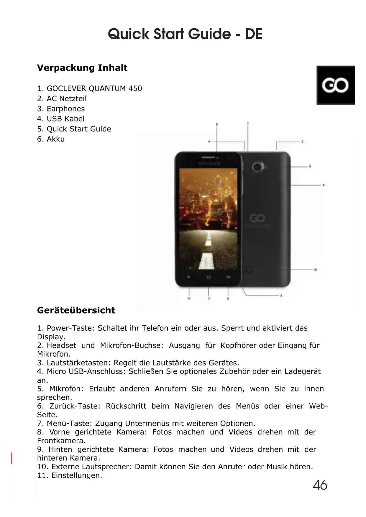 Quick Start Guide - DE 46Entfernen der Akkuabdeckung und des Akkus Entfernen Sie die hintere Abdeckung, indem Sie einen Fingernagel in den Schlitzan der Unterseite des Telefons schieben. Heben Sie die Abdeckung nach obenund weg vom Telefon. Entnehmen des Akkus: Halten Sie das Telefon mit einer Hand gut fest und entnehmen Sie den Akku. Einsetzen der SIM Karte und Micro SD Karte a. SIM Karte Der Steckplatz an der linken Seite ist für GSM Karten vorgesehen. Der Steckplatz an der rechten Seite ist für 3G WCMDA Karten vorgesehen (kompatibel mit 2G Karten). Führen Sie die SIM Karten vorsichtig in den entsprechenden Steckplatz bis die Karte einrastet. Stellen Sie sicher das die Kontakte anliegen. Zum Entfernen der Karten, ziehen Sie diese vorsichtig aus dem Steckplatz. b. MicroSD Karte Führen Sie die Micro SD Karte vorsichtig in den entsprechenden Steckplatz bis die Karte einrastet. Stellen Sie sicher dass die Kontakte anliegen. Zum Entfernen der Karte, ziehen Sie diese vorsichtig aus dem Steckplatz. Auaden: Stecken Sie das USB Kabel in den vorgesehenen Anschluß am Telefon. Schließen Sie nun das Ladegerät an einer Wechselstrom Steckdose an. Eine vollständige Ladung dauert ca. 3,5 Stunden. Ein Betrieb des Gerätes während der Ladung verzögert diesen Zeitraum. Quick Start Guide - DE 47Quick Start Guide - DE Hinweis: Auch wenn Sie das Gerät nicht nutzen entlädt sich der Akku. Bitte laden Sie das Gerät sporadisch auf. Einschalten / Schlafmodus / Auschalten des Gerätes Halten Sie den Power Knopf für einige Sekunden. Das Gerät schaltet ein. Eserscheint automatisch der Start Bildschirm nach dem Start Vorgang.Im eingeschalteten Zustand gelangen Sie durch kurzes Drücken des Power Knopfes in den Schlafmodus. Ein erneutes Drücken schaltet das Gerät wieder ein. Im eingeschalteten Zustand gelangen Sie durch langes Drücken des Power Knopfes in das PowerOff Menu, wählen Sie hier die Funktion Ausschalten des Gerätes. Konformitätserklärung: GOCLEVER QUANTUM 450 in Übereinstimmung mit den grundlegenden Anforderungen der f olgenden Richtlinien ist: EMC Richtlinie 2004 / 108 / E C LVD Richtlinie 2006 / 95 / E C R&TTE Richtlinie 1999 / 5 / E C Das vollständige Dokument mit detaillierten Informationen finden Sie auf unserer Website: www.goclever.com. Die PDF Da tei mit der CE -Erklärung finden Sie in unser em Produktkatalog. Bitte lesen Sie unser e Datenschutz-und Cookie- Policy untern www.goclever.com. Dieses Produkt wurde als RoHS-konform zertifiziert. Korrekte Entsorgung dieses Produkts (Waste Electrical & Electronic Equipment). (Gültig in der Europäischen Union und anderen europäischen Ländern mit einem separaten Sammelsystem) Dieses Symbol zeigt an, dass bei der Entsorgung darauf geachtet werden muss, es nichts in den normalen Hausmüll zu werfen. Um möglichen Schäden an der Umwelt und der Gesundheit zu vermeiden, sollte Sie die Entsorgung vorschriftsgemäß ausführen und vom normalen Hausmüll trennen und an einer entsprechenden Stelle abgeben um die nachhaltige Wiederverwertung der Rohstoffe zu gewährleisten. Zur Entsorgung nutzen Sie bitte die Sammel und Recyclingprogramme in Ihrer Nähe oder kontaktieren Sie den Händler bei dem Sie das Produkt gekauft haben. Dort kann das Gerät das passend entsorgt werden. 48Entsorgung von Batterien (Gültig in der Europäischen Union und anderen europäi schen Ländern mit einem separaten Sammelsystem) Durch das oben stehende Symbol wird darauf hingewiesen, dass Batterien und oder Akkus gesammelt und getrennt vom Hausmüll entsorgt werden müssen.Wenn die Batterie oder der Akku einen höheren als den festgelegten Wert an Blei (Pb), Quecksilber (Hg) und/ oder Kadmium (Cd) enthalten, der in der Batterie Direktive (2006/66/ EC) festgelegt ist, sind die chemischen Symbole (Pb,Hg,Cd) unter dem oben stehenden Symbol abgebildet. Durch die getrennte Entsorgung der Batterien helfen Sie, potenzielle Umweltschäden und Gesundheitsgefahren zu verhindern, die ansonsten bei einer vorschriftswidrigen Entsorgung von Produkten und Batterien verursacht werden können. Zur Entsorgung nutzen Sie bitte die Sammel und Recyclingprogramme in Ihrer Nähe oder kontaktieren Sie den Händler bei dem Sie das Produkt gekauft haben. Dort kann das Gerät das passend entsorgt werden. Wireless LAN-Vorschriften Je nach Mode ll kann das im Ger ät integrierte Wireless LAN nur in f olgenden Ländern verwendet werden: Österreich, Belgien, Bulgarien, Zypern, Tschechische Republik, Deutschland, Dänemark, Estland, Griechenland, Spanien, Finnland, Frankreich, Großbrtannien, Ungarn, Irland, Italien, Litauen, Luxemburg, Lettland, Malta, die Niederlande, Polen, Portugal, Rumänien, Schweden, Slowenien, Slowakei, Norwegen. GOCLEVER’S ALLGEMEINE Garantiebedingungen: 1.Straße 4a , im Folgenden als Garantiegeber genannt, garantiert, dass GOCLEVER Produkte frei von Design -oder Materialfehler sind , die ihre Funktionalität beeinträchtigen könnten Vorausgesetzt, dass die Bedienungsanleitung eingehalten wurde . 2 . Diese Garantie gilt nur für Deutschland . 3 . Der Garantiegeber muss mögliche Defekte des Gerätes beheben. Voraussetzung hierfür ist, dass die Garantiekarte in am Kauftag ausgefüllt wird und zusammen mit einem Kaufbeleg vorgelegt wurde Etwaige Änderungen oder Korrekturen in der Garantiekarte durch unbefugte Personen haben den Verlust der Rechte aus dieser Garantie zur Folge. 4 . Die Dauer der Gewährleistung für GOCLEVER Geräte beträgt 24 Mo- nate ab Kaufdatum, längstens jedoch 27 Monate ab dem Herstellun- gszeitpunkt. Quick Start Guide - DE 495 . innerhalb der ersten 12 Monaten ab dem Kauf, jedoch nicht mehr als 15 Monate ab dem Datum der Produktion erfolgt die Abwicklung als Tür zu Tür-Service. Nach diesem Zeitraum sendet der Käufer mit einer zuvor erhaltenen RMA-Nummer in Übereinstimmung mit der RMA-Verfahren das defekte Gerät zur Reparatur ein. 6 . Garantie für Displays und Batterien in GOCLEVER Produkte ist auf 6 Monate begrenzt Produkte, TFT LCD-