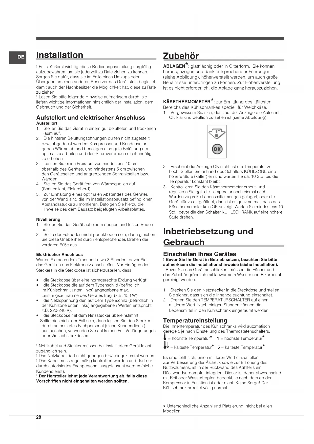 DE Installation ! Esistäußerstwichtig,dieseBedienungsanleitungsorgfältigaufzubewahren,umsiejederzeitzuRateziehenzukönnen.SorgenSiedafür,dasssieimFalleeinesUmzugsoderÜbergabeaneinenanderenBenutzerdasGerätstetsbegleitet,damitauchderNachbesitzerdieMöglichkeithat,diesezuRatezuziehen.! LesenSiebittefolgendeHinweiseaufmerksamdurch,sieliefernwichtigeInformationenhinsichtlichderInstallation,demGebrauchundderSicherheit. Aufstellort und elektrischer Anschluss Aufstellort1. StellenSiedasGerätineinemgutbelüftetenundtrockenenRaumauf.2. DiehinterenBelüftungsöffnungendürfennichtzugestelltbzw.abgedecktwerden:KompressorundKondensatorgebenWärmeabundbenötigeneineguteBelüftungumoptimalzuarbeitenunddenStromverbrauchnichtunnötigzuerhöhen3. LassenSieeinenFreiraumvonmindestens10cmoberhalbdesGerätes,undmindestens5cmzwischendenGeräteseitenundangrenzendenSchrankseitenbzw.Wänden.4. StellenSiedasGerätfernvonWärmequellenauf(Sonnenlicht,Elektroherd).5. ZurEinhaltungeinesoptimalenAbstandesdesGerätesvonderWandsinddieimInstallationsbausatzbefindlichenAbstandsstückezumontieren.BefolgenSiehierzudieHinweisedesdemBausatzbeigefügtenArbeitsblattes.Nivellierung1. StellenSiedasGerätaufeinemebenenundfestenBoden auf. 2. SolltederFußbodennichtperfektebensein,danngleichenSiedieseUnebenheitdurchentsprechendesDrehendervorderenFüßeaus.Elektrischer AnschlussWartenSienachdemTransportetwa3Stunden,bevorSiedasGerätandasElektronetzanschließen.VorEinfügendesSteckersindieSteckdoseistsicherzustellen,dass• dieSteckdoseübereinenormgerechteErdungverfügt;• dieSteckdosedieaufdemTypenschild(befindlichimKühlschrankuntenlinks)angegebenemax.LeistungsaufnahmedesGerätesträgt(z.B.150W);• dieNetzspannungdenaufdemTypenschild(befindlichinderKühlzoneuntenlinks)angegebenenWertenentsprichtz.B.220-240V);• dieSteckdosemitdemNetzsteckerübereinstimmt. SolltediesnichtderFallsein,dannlassenSiedenSteckerdurchautorisiertesFachpersonal(sieheKundendienst)austauschen;verwendenSieaufkeinenFallVerlängerungenoderVielfachsteckdosen.! NetzkabelundSteckermüssenbeiinstalliertemGerätleichtzugänglichsein.! DasNetzkabeldarfnichtgebogenbzw.eingeklemmtwerden.! DasKabelmussregelmäßigkontrolliertwerdenunddarfnurdurchautorisiertesFachpersonalausgetauschtwerden(sieheKundendienst).! Der Hersteller lehnt jede Verantwortung ab, falls diese Vorschriften nicht eingehalten werden sollten. Zubehör ABLAGEN*:glattflächigoderinGitterform.SiekönnenherausgezogenunddankentsprechenderFührungen(sieheAbbildung),höhenverstelltwerden,umauchgroßeBehältnisseunterbringenzukönnen.ZurHöhenverstellungistesnichterforderlich,dieAblageganzherauszuziehen.KÄSETHERMOMETER *:zurErmittlungdeskältesten BereichsdesKühlschrankesspeziellfürWeichkäse.1. VergewissernSiesich,dassaufderAnzeigedieAufschriftOKklarunddeutlichzusehenist(sieheAbbildung). 2. ErscheintdieAnzeigeOKnicht,istdieTemperaturzuhoch:StellenSieanhanddesSchaltersKÜHLZONEeinehöhereStufe(kälter)einundwartensieca.10Std.bisdieTemperaturkonstantbleibt.3. KontrollierenSiedenKäsethermometererneut,undregulierenSieggf.dieTemperaturnocheinmalnach.WurdenzugroßeLebensmittelmengengelagert,oderdieGerätetürzuoftgeöffnet,dannistesganznormal,dassdasKäsethermometerkeinOKanzeigt.WartenSiemindestens10Std.,bevordiedenSchalterKÜHLSCHRANKaufeinehöhereStufedrehen. Inbetriebsetzung und
