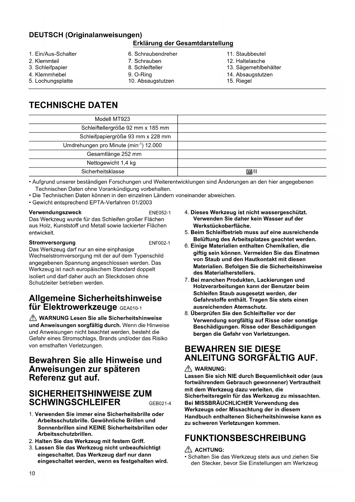 - Gewicht entsprechend EPTA-Verfahren 01/2003 Verwendungszweck ENE052-1 Das Werkzeug wurde für das Schleifen großer Flächen aus Holz, Kunststoff und Metall sowie lackierter Flächen entwickelt. Stromversorgung ENF002-1 Das Werkzeug darf nur an eine einphasige Wechselstromversorgung mit der auf dem Typenschild angegebenen Spannung angeschlossen werden. Das Werkzeug ist nach europäischem Standard doppelt isoliert und darf daher auch an Steckdosen ohne Schutzleiter betrieben werden. Allgemeine Sicherheitshinweise für Elektrowerkzeuge GEA010-1 WARNUNG Lesen Sie alle Sicherheitshinweise und Anweisungen sorgfältig durch. Wenn die Hinweise und Anweisungen nicht beachtet werden, besteht die Gefahr eines Stromschlags, Brands und/oder das Risiko von ernsthaften Verletzungen. Bewahren Sie alle Hinweise und Anweisungen zur späteren Referenz gut auf. SICHERHEITSHINWEISE ZUM SCHWINGSCHLEIFER GEB021-4