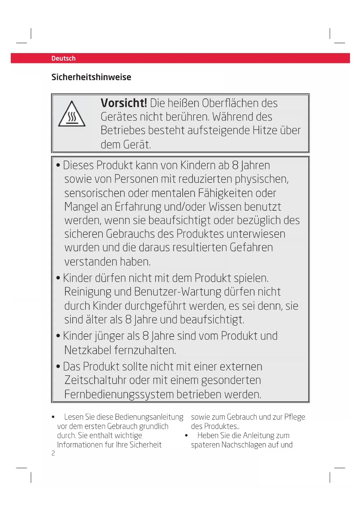 - Das Produkt sollte nicht mit einer externen Zeitschaltuhr oder mit einem gesonderten Fernbedienungssystem betrieben werden. Sicherheitshinweise heben Sie sie mit dem Gerat weiter.