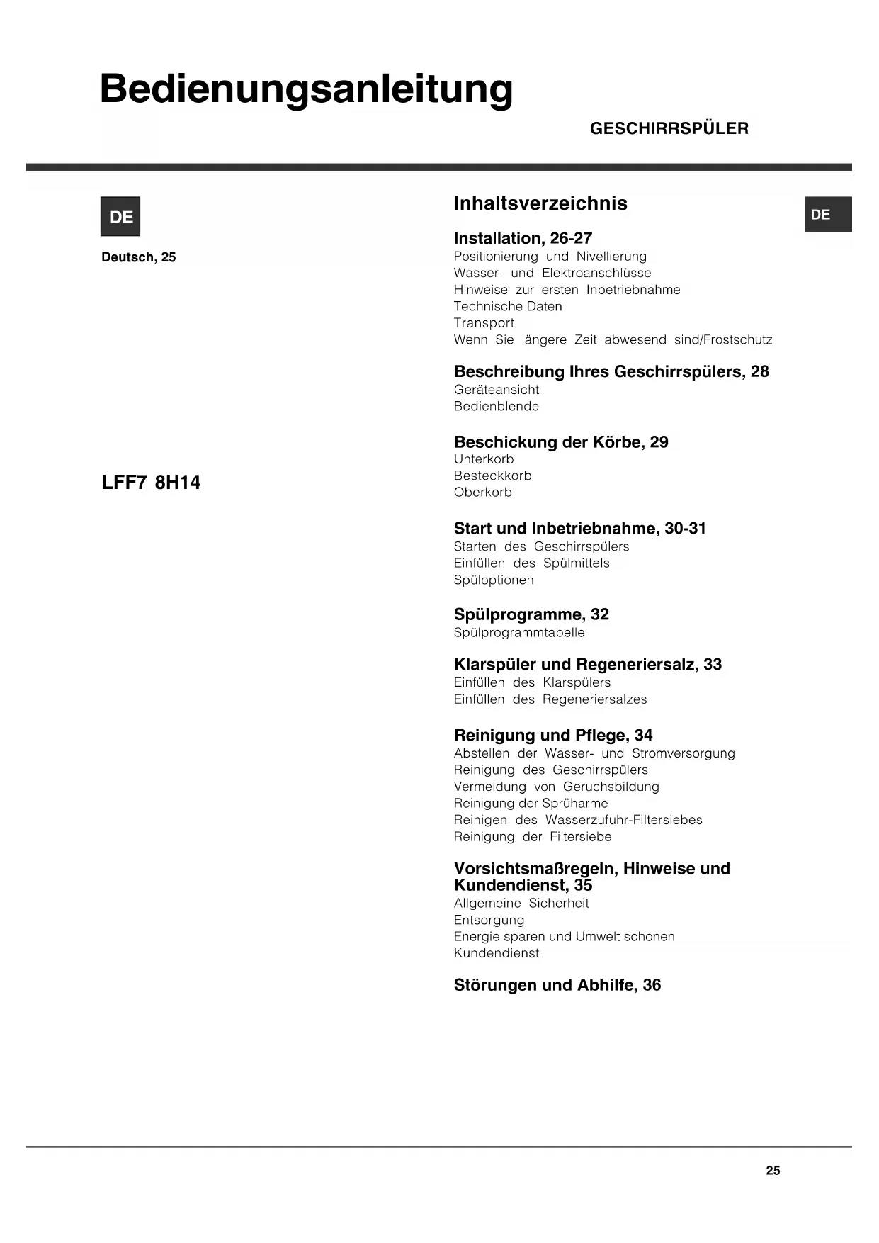 Bedienungsanleitung Inhaltsverzeichnis Installation, 26-27 Positionierung und Nivellierung Wasser- und Elektroanschlüsse Hinweise zur ersten Inbetriebnahme Technische Daten Transport Wenn Sie längere Zeit abwesend sind/Frostschutz Beschreibung Ihres Geschirrspülers, 28 Geräteansicht Bedienblende Beschickung der Körbe, 29 Unterkorb Besteckkorb Oberkorb Start und Inbetriebnahme, 30-31 Starten des Geschirrspülers Einfüllen des Spülmittels Spüloptionen Spülprogramme, 32 Spülprogrammtabelle Klarspüler und Regeneriersalz, 33 Einfüllen des Klarspülers Einfüllen des Regeneriersalzes Reinigung und Pflege, 34 Abstellen der Wasser- und Stromversorgung Reinigung des Geschirrspülers Vermeidung von Geruchsbildung Reinigung der Sprüharme Reinigen des Wasserzufuhr-Filtersiebes Reinigung der Filtersiebe Vorsichtsmaßregeln, Hinweise und Kundendienst, 35 Allgemeine Sicherheit Entsorgung Energie sparen und Umwelt schonen Kundendienst Störungen und Abhilfe, 36 LFF7 8H14