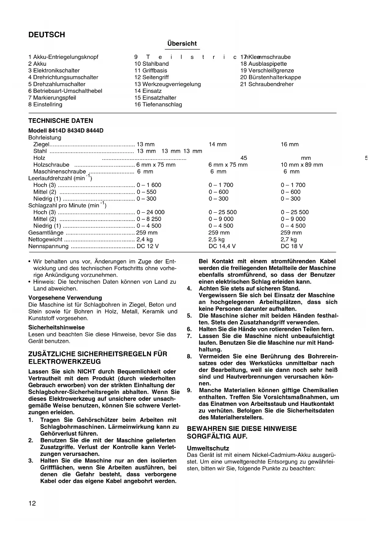 TECHNISCHE DATEN Modell 8414D 8434D 8444D Bohrleistung