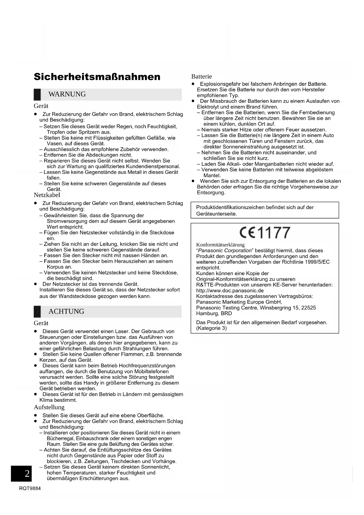 PANASONIC ÜBERNIMMT KEINE VERANTWORTUNG FÜR SACHSCHÄDEN UND/