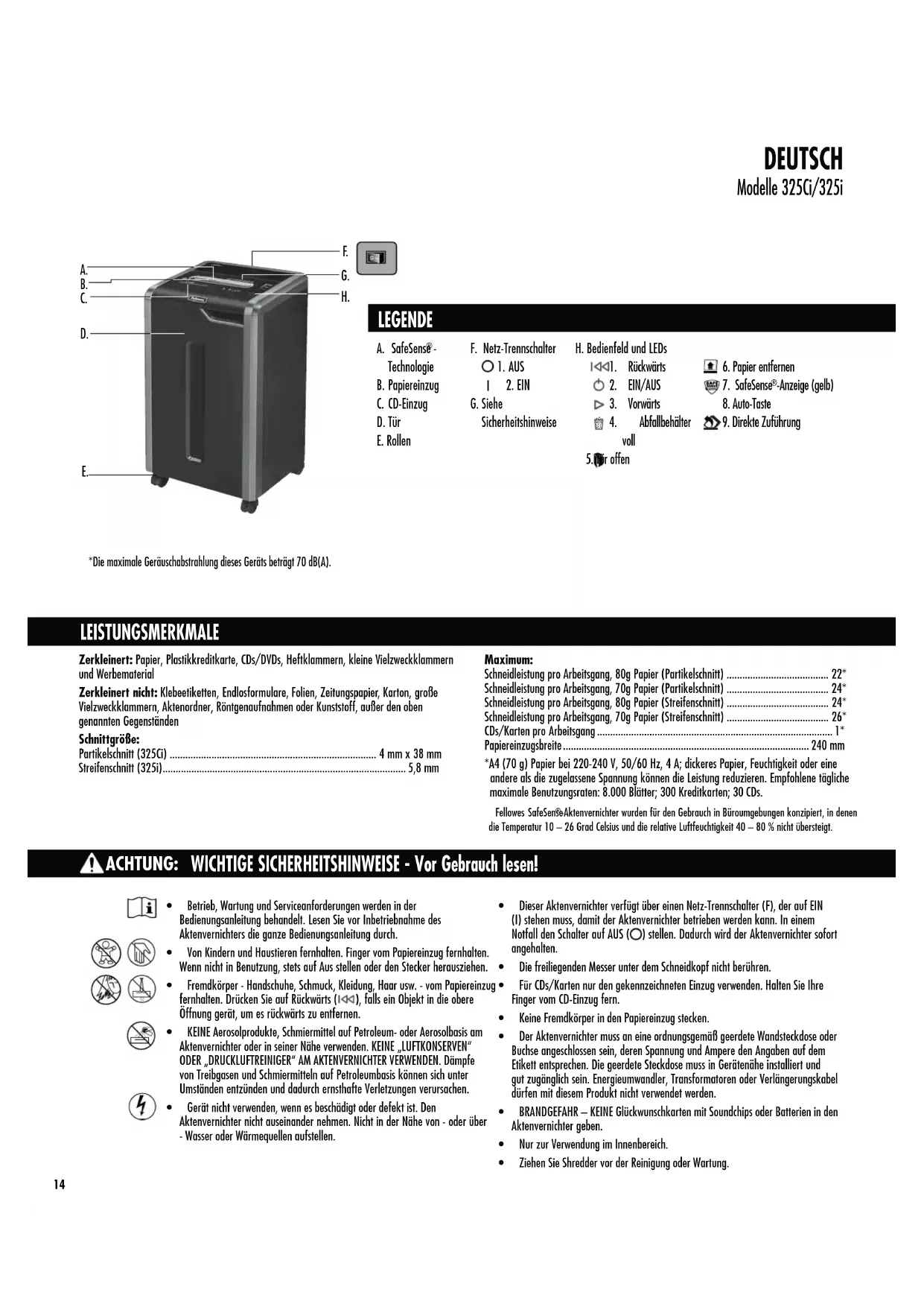 DEUTSCH Modelle 325Ci/325i Zerkleinert: Papier, Plastikkreditkarte, CDs/DVDs, Heftklammern, kleine Vielzweckklammern und Werbematerial Zerkleinert nicht:,MFCFFUJLFUUFO&OEMPTGPSNVMBSF'PMJFO;FJUVOHTQBQJFS,BSUPOHSPF 7JFM[XFDLLMBNNFSO"LUFOPSEOFS3ÚOUHFOBVGOBINFOPEFS,VOTUTUPGGBVFSEFOPCFOgenannten Gegenständen Schnittgröße: Partikelschnitt (325Ci) 4 mm x 38 mm Streifenschnitt (325i) 5,8 mm Maximum: Schneidleistung pro Arbeitsgang, 80g Papier (Partikelschnitt) 22* Schneidleistung pro Arbeitsgang, 70g Papier (Partikelschnitt) 24* Schneidleistung pro Arbeitsgang, 80g Papier (Streifenschnitt) 24* Schneidleistung pro Arbeitsgang, 70g Papier (Streifenschnitt) 26* $%T,BSUFOQSP"SCFJUTHBOH 1*