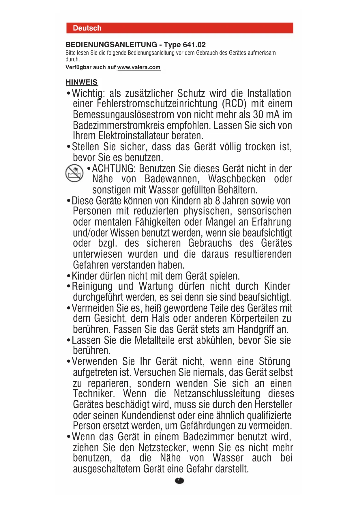 GARANTIEBEDINGUNGEN VALERA leistet für dieses Gerät – zusätzlich zu der gesetzlichen Gewährleistung des Händlers aus