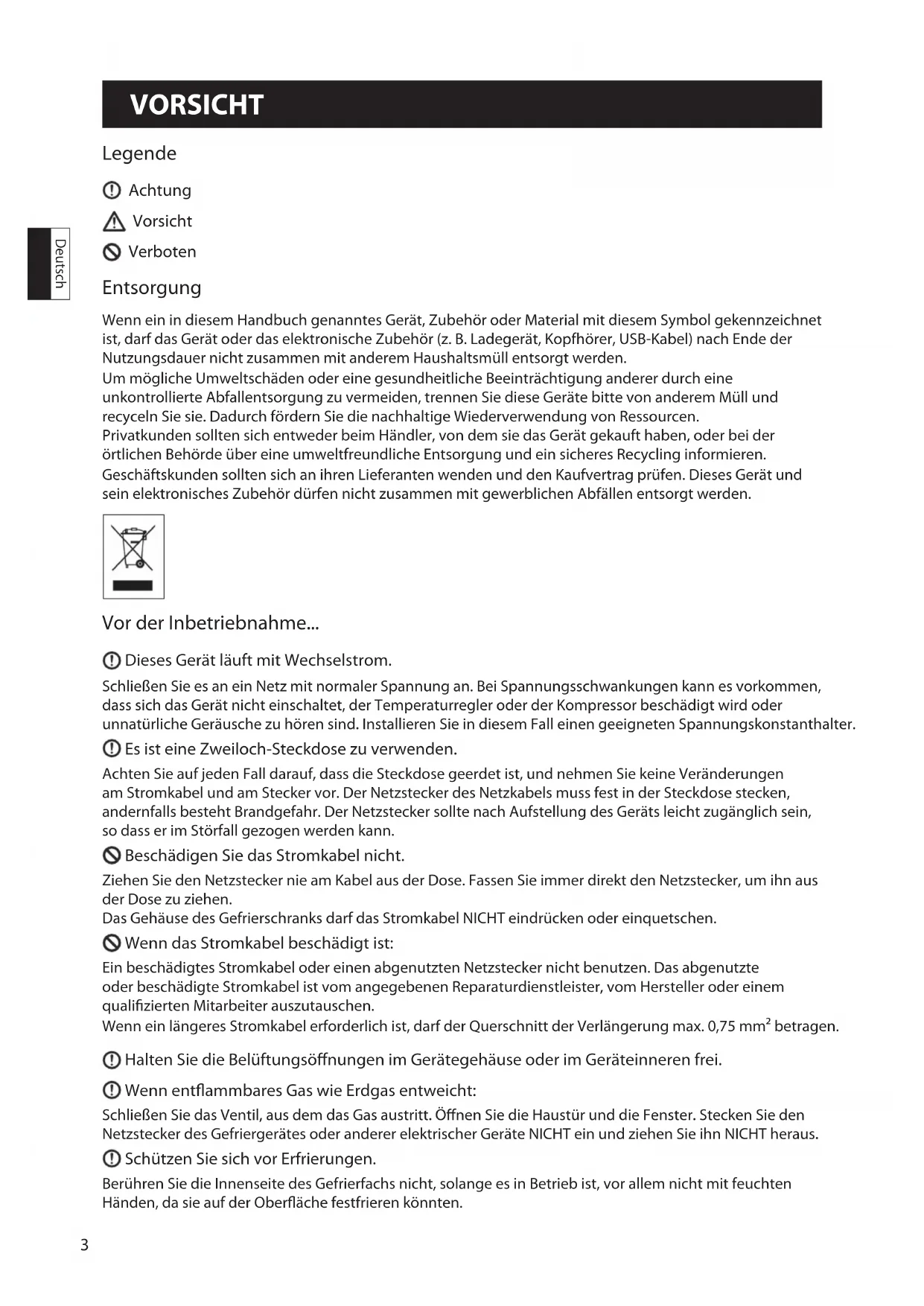 VORSICHT Deutsch Reinigen Sie die Rückseite des Gefrierschranks regelmäßig. Staub erhöht den Energieverbrauch.