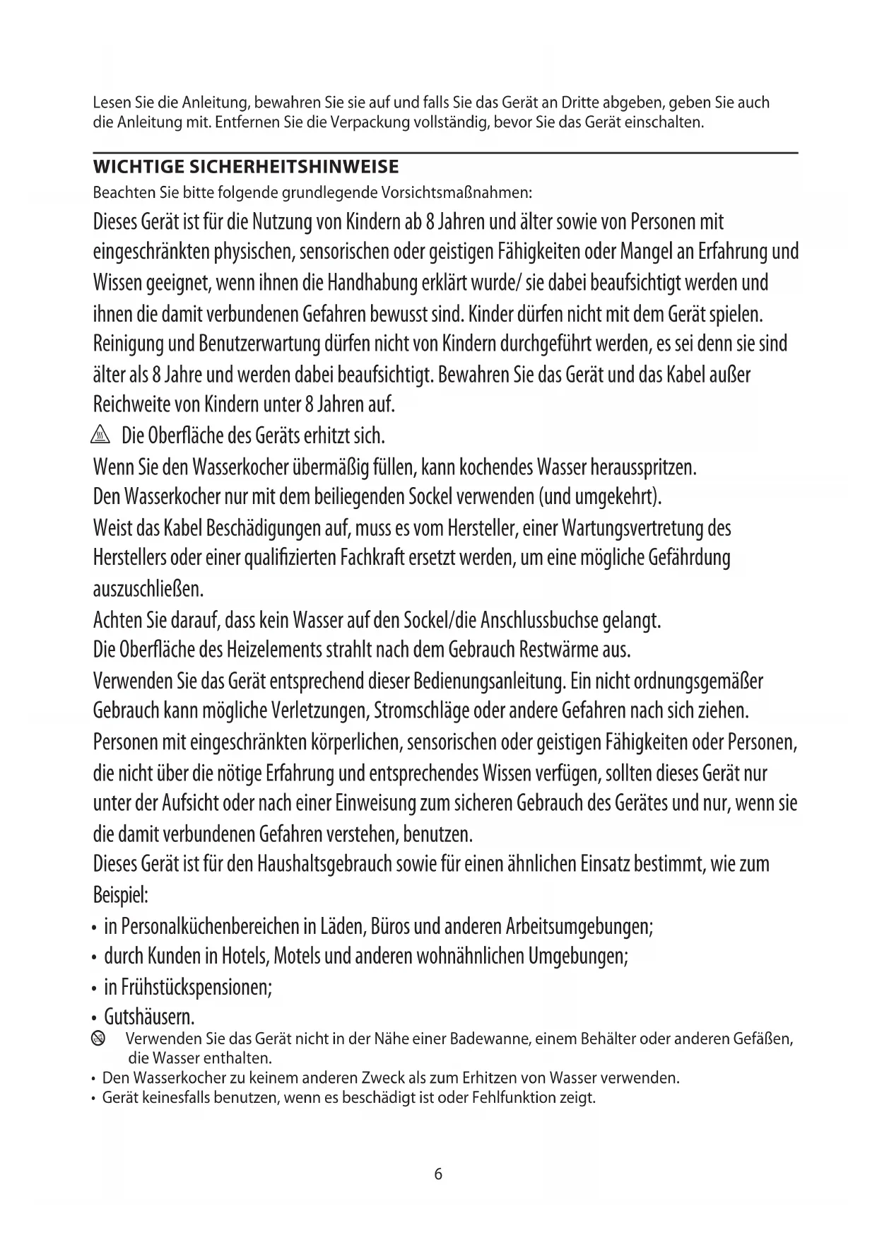 • Den Wasserkocher zu keinem anderen Zweck als zum Erhitzen von Wasser verwenden.