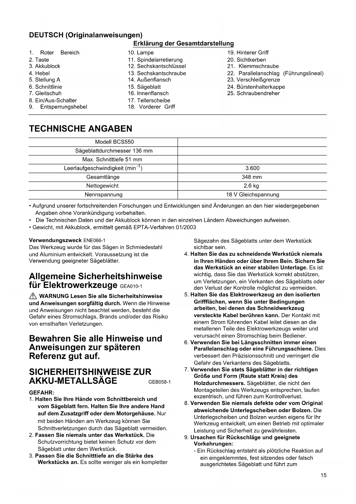 SICHERHEITSHINWEISE ZUR AKKU-METALLSÄGE GEB058-1