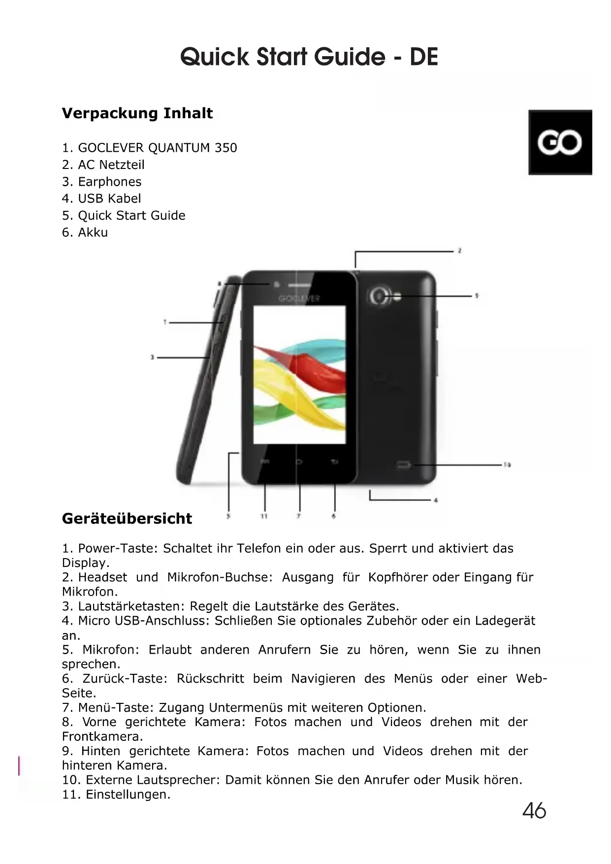 Quick Start Guide - DE 46Entfernen der Akkuabdeckung und des Akkus Entfernen Sie die hintere Abdeckung, indem Sie einen Fingernagel in den Schlitzan der Unterseite des Telefons schieben. Heben Sie die Abdeckung nach obenund weg vom Telefon. Entnehmen des Akkus: Halten Sie das Telefon mit einer Hand gut fest und entnehmen Sie den Akku. Einsetzen der SIM Karte und Micro SD Karte a. SIM Karte Der Steckplatz an der linken Seite ist für GSM Karten vorgesehen. Der Steckplatz an der rechten Seite ist für 3G WCMDA Karten vorgesehen (kompatibel mit 2G Karten). Führen Sie die SIM Karten vorsichtig in den entsprechenden Steckplatz bis die Karte einrastet. Stellen Sie sicher das die Kontakte anliegen. Zum Entfernen der Karten, ziehen Sie diese vorsichtig aus dem Steckplatz. b. MicroSD Karte Führen Sie die Micro SD Karte vorsichtig in den entsprechenden Steckplatz bis die Karte einrastet. Stellen Sie sicher dass die Kontakte anliegen. Zum Entfernen der Karte, ziehen Sie diese vorsichtig aus dem Steckplatz. Auaden: Stecken Sie das USB Kabel in den vorgesehenen Anschluß am Telefon. Schließen Sie nun das Ladegerät an einer Wechselstrom Steckdose an. Eine vollständige Ladung dauert ca. 3,5 Stunden. Ein Betrieb des Gerätes während der Ladung verzögert diesen Zeitraum. Quick Start Guide - DE 47Quick Start Guide - DE Hinweis: Auch wenn Sie das Gerät nicht nutzen entlädt sich der Akku. Bitte laden Sie das Gerät sporadisch auf. Einschalten / Schlafmodus / Auschalten des Gerätes Halten Sie den Power Knopf für einige Sekunden. Das Gerät schaltet ein. Eserscheint automatisch der Start Bildschirm nach dem Start Vorgang.Im eingeschalteten Zustand gelangen Sie durch kurzes Drücken des Power Knopfes in den Schlafmodus. Ein erneutes Drücken schaltet das Gerät wieder ein. Im eingeschalteten Zustand gelangen Sie durch langes Drücken des Power Knopfes in das PowerOff Menu, wählen Sie hier die Funktion Ausschalten des Gerätes. Konformitätserklärung: GOCLEVER QUANTUM 350 in Übereinstimmung mit den grundlegenden Anforderungen der f olgenden Richtlinien ist: EMC Richtlinie 2004 / 108 / E C LVD Richtlinie 2006 / 95 / E C R&TTE Richtlinie 1999 / 5 / E C Das vollständige Dokument mit detaillierten Informationen finden Sie auf unserer Website: www.goclever.com. Die PDF Da tei mit der CE -Erklärung finden Sie in unser em Produktkatalog. Bitte lesen Sie unser e Datenschutz-und Cookie- Policy untern www.goclever.com. Dieses Produkt wurde als RoHS-konform zertifiziert. Korrekte Entsorgung dieses Produkts (Waste Electrical & Electronic Equipment). (Gültig in der Europäischen Union und anderen europäischen Ländern mit einem separaten Sammelsystem) Dieses Symbol zeigt an, dass bei der Entsorgung darauf geachtet werden muss, es nichts in den normalen Hausmüll zu werfen. Um möglichen Schäden an der Umwelt und der Gesundheit zu vermeiden, sollte Sie die Entsorgung vorschriftsgemäß ausführen und vom normalen Hausmüll trennen und an einer entsprechenden Stelle abgeben um die nachhaltige Wiederverwertung der Rohstoffe zu gewährleisten. Zur Entsorgung nutzen Sie bitte die Sammel und Recyclingprogramme in Ihrer Nähe oder kontaktieren Sie den Händler bei dem Sie das Produkt gekauft haben. Dort kann das Gerät das passend entsorgt werden. 48Entsorgung von Batterien (Gültig in der Europäischen Union und anderen europäi schen Ländern mit einem separaten Sammelsystem) Durch das oben stehende Symbol wird darauf hingewiesen, dass Batterien und oder Akkus gesammelt und getrennt vom Hausmüll entsorgt werden müssen.Wenn die Batterie oder der Akku einen höheren als den festgelegten Wert an Blei (Pb), Quecksilber (Hg) und/ oder Kadmium (Cd) enthalten, der in der Batterie Direktive (2006/66/ EC) festgelegt ist, sind die chemischen Symbole (Pb,Hg,Cd) unter dem oben stehenden Symbol abgebildet. Durch die getrennte Entsorgung der Batterien helfen Sie, potenzielle Umweltschäden und Gesundheitsgefahren zu verhindern, die ansonsten bei einer vorschriftswidrigen Entsorgung von Produkten und Batterien verursacht werden können. Zur Entsorgung nutzen Sie bitte die Sammel und Recyclingprogramme in Ihrer Nähe oder kontaktieren Sie den Händler bei dem Sie das Produkt gekauft haben. Dort kann das Gerät das passend entsorgt werden. Wireless LAN-Vorschriften Je nach Mode ll kann das im Ger ät integrierte Wireless LAN nur in f olgenden Ländern verwendet werden: Österreich, Belgien, Bulgarien, Zypern, Tschechische Republik, Deutschland, Dänemark, Estland, Griechenland, Spanien, Finnland, Frankreich, Großbrtannien, Ungarn, Irland, Italien, Litauen, Luxemburg, Lettland, Malta, die Niederlande, Polen, Portugal, Rumänien, Schweden, Slowenien, Slowakei, Norwegen. GOCLEVER’S ALLGEMEINE Garantiebedingungen: 1.Straße 4a , im Folgenden als Garantiegeber genannt, garantiert, dass GOCLEVER Produkte frei von Design -oder Materialfehler sind , die ihre Funktionalität beeinträchtigen könnten Vorausgesetzt, dass die Bedienungsanleitung eingehalten wurde . 2 . Diese Garantie gilt nur für Deutschland . 3 . Der Garantiegeber muss mögliche Defekte des Gerätes beheben. Voraussetzung hierfür ist, dass die Garantiekarte in am Kauftag ausgefüllt wird und zusammen mit einem Kaufbeleg vorgelegt wurde Etwaige Änderungen oder Korrekturen in der Garantiekarte durch unbefugte Personen haben den Verlust der Rechte aus dieser Garantie zur Folge. 4 . Die Dauer der Gewährleistung für GOCLEVER Geräte beträgt 24 Mo- nate ab Kaufdatum, längstens jedoch 27 Monate ab dem Herstellun- gszeitpunkt. Quick Start Guide - DE 495 . innerhalb der ersten 12 Monaten ab dem Kauf, jedoch nicht mehr als 15 Monate ab dem Datum der Produktion erfolgt die Abwicklung als Tür zu Tür-Service. Nach diesem Zeitraum sendet der Käufer mit einer zuvor erhaltenen RMA-Nummer in Übereinstimmung mit der RMA-Verfahren das defekte Gerät zur Reparatur ein. 6 . Garantie für Displays und Batterien in GOCLEVER Produkte ist auf 6 Monate begrenzt Produkte, TFT LCD-