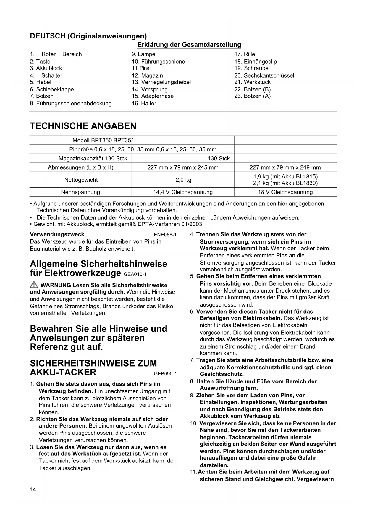 SICHERHEITSHINWEISE ZUM AKKU-TACKER GEB090-1