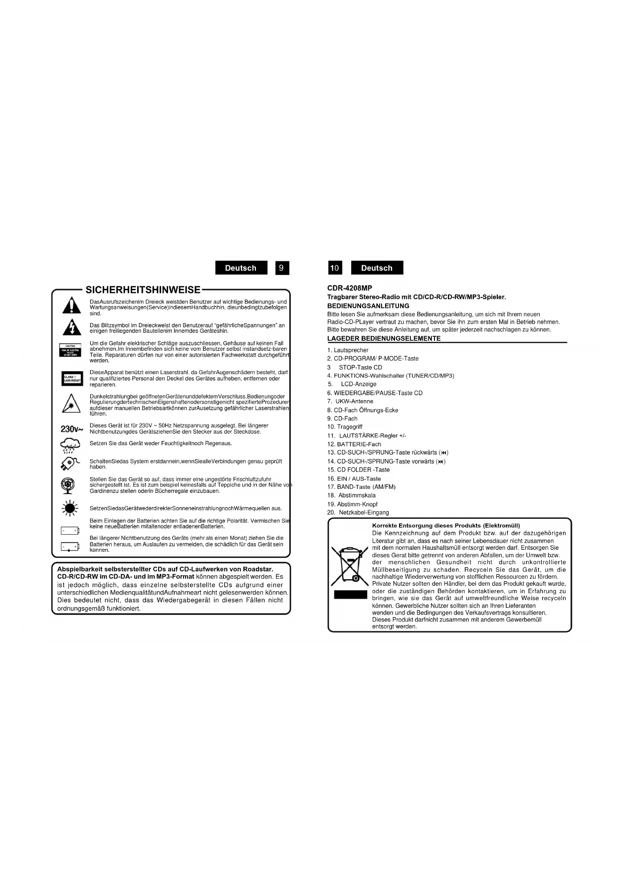 Netzkabel-Eingang14. CD-SUCH-/SPRUNG-Taste vorwärts ()15. CD FOLDER -TasteKorrekte Entsorgung dieses Produkts (Elektromüll) Die Kennzeichnung auf dem Produkt bzw. auf der dazugehörigen Literatur gibt an, dass es nach seiner Lebensdauer nicht zusammenmit dem normalen HaushaltsmüIl entsorgt werden darf. Entsorgen Siedieses Gerat bitte getrennt von anderen Abfallen, um der Umwelt bzw. der menschlichen Gesundheit nicht durch unkontrollierte Müllbeseitigung zu schaden. Recyceln Sie das Gerät, um die nachhaltige Wiederverwertung von stofflichen Ressourcen zu fördern. Private Nutzer sollten den Händler, bei dem das Produkt gekauft wurde, oder die zuständigen Behörden kontaktieren, um in Erfahrung zu bringen, wie sie das Gerät auf umweltfreundliche Weise recyceln können. Gewerbliche Nutzer sollten sich an Ihren Lieferantenwenden und die Bedingungen des Verkaufsvertrags konsultieren.Dieses Produkt darfnicht zusammen mit anderem Gewerbemüllentsorgt werden. Deutsch 9 10 Deutsch CDR-4208MP Tragbarer Stereo-Radio mit CD/CD-R/CD-RW/MP3-Spieler. 3 STOP-Taste CD4. FUNKTIONS-Wahlschalter (TUNER/CD/MP3)5. LCD-Anzeige16. EIN / AUS-Taste17. BAND-Taste (AM/FM)18. Abstimmskala11. LAUTSTÄRKE-Regler +/-12. BATTERIE-Fach13. CD-SUCH-/SPRUNG-Taste rückwärts ()6. WIEDERGABE/PAUSE-Taste CD7. UKW-AntenneDeutschDeutsch RUNDFUNKEMPFANG