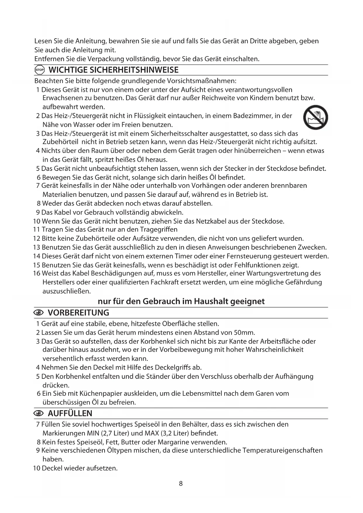 7 Füllen Sie soviel hochwertiges Speiseöl in den Behälter, dass es sich zwischen den Markierungen MIN (2,7 Liter) und MAX (3,2 Liter) befindet. 8 Kein festes Speiseöl, Fett, Butter oder Margarine verwenden. 9 Keine verschiedenen Öltypen mischen, da diese unterschiedliche Temperatureigenschaften haben. 10 Deckel wieder aufsetzen.9 Bedienungsanleitung
