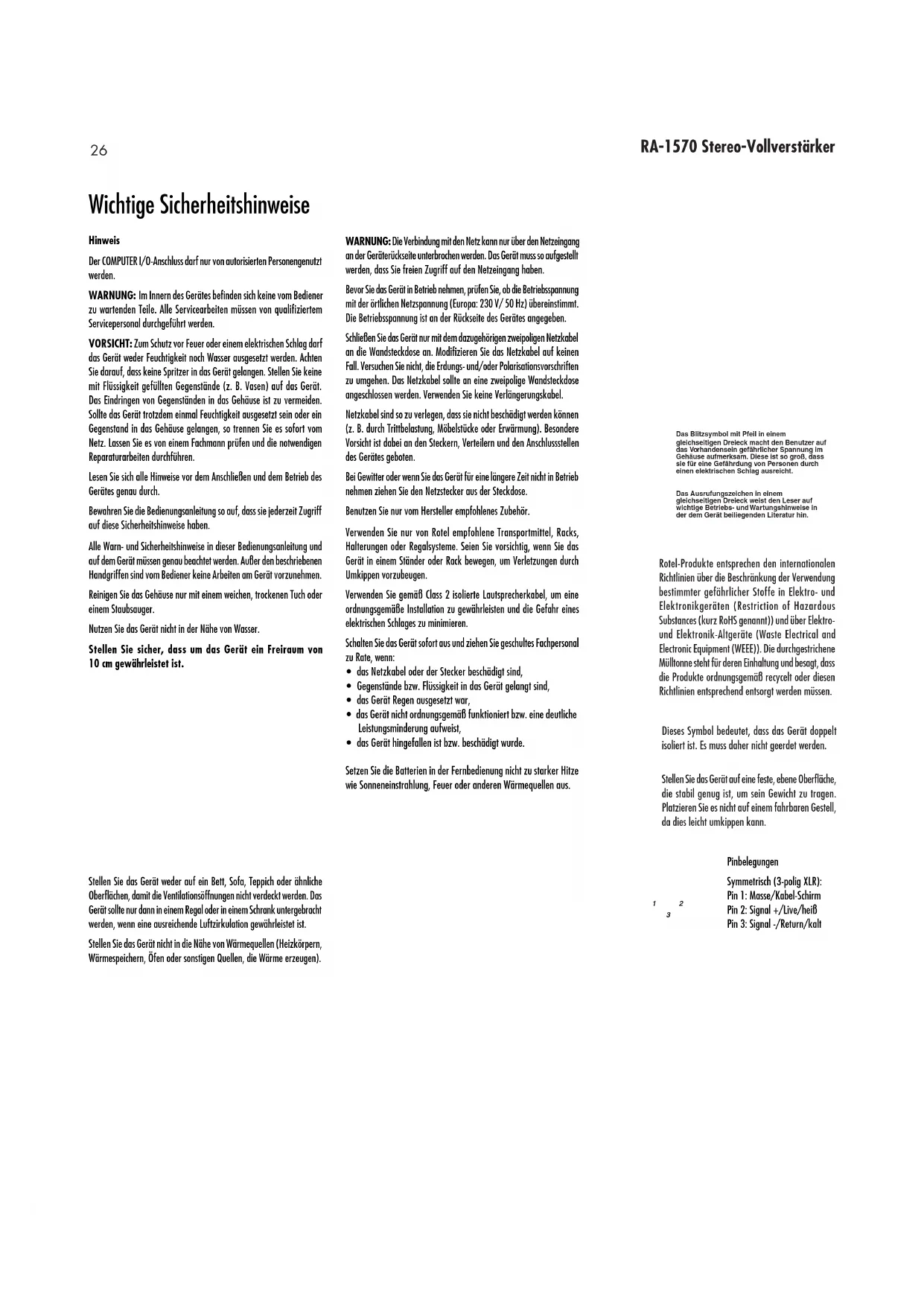Poids (net) 13 kgs, 28.7 lbs. Toutes les spécifications sont garanties exactes au moment de l’impression. Rotel se réserve le droit de les modifier sans préavis. Rotel et le logo Rotel HiFi sont des marques déposées de The Rotel Co, Ltd, Tokyo, Japon. “Made for iPod,” et “Made for iPhone,” signifie qu’un appareil ou accessoire électronique a été conçu pour être connecté spécifiquement à l’iPod ou à l’iPhone, respectivement, et qu’il a été certifié par le fabricant pour répondre aux normes de performances requises par Apple. Apple n’est pas responsable du fonctionnement de l’appareil ou de sa conformité avec les différents normes de sécurité ou de régularisation. Veuillez noter que l’utilisation de cet accessoire avec l’iPod ou l’iPhone peut affecter ses performances de fonctionnement sans fil. iPhone, iPod, iPod classic, iPod nano, et iPod touch sont des marques déposées d’Apple Inc., enregistrées aux États‑Unis et d’autres pays.26 27 RA‑1570 Stereo‑Vollverstärker Hinweis Der COMPUTER I/O-Anschluss darf nur von autorisierten Personengenutzt werden. WARNUNG: Im Innern des Gerätes befinden sich keine vom Bediener zu wartenden Teile. Alle Servicearbeiten müssen von qualifiziertem Servicepersonal durchgeführt werden. VORSICHT: Zum Schutz vor Feuer oder einem elektrischen Schlag darf das Gerät weder Feuchtigkeit noch Wasser ausgesetzt werden. Achten Sie darauf, dass keine Spritzer in das Gerät gelangen. Stellen Sie keine mit Flüssigkeit gefüllten Gegenstände (z. B. Vasen) auf das Gerät. Das Eindringen von Gegenständen in das Gehäuse ist zu vermeiden. Sollte das Gerät trotzdem einmal Feuchtigkeit ausgesetzt sein oder ein Gegenstand in das Gehäuse gelangen, so trennen Sie es sofort vom Netz. Lassen Sie es von einem Fachmann prüfen und die notwendigen Reparaturarbeiten durchführen. Lesen Sie sich alle Hinweise vor dem Anschließen und dem Betrieb des Gerätes genau durch. Bewahren Sie die Bedienungsanleitung so auf, dass sie jederzeit Zugriff auf diese Sicherheitshinweise haben. Alle Warn- und Sicherheitshinweise in dieser Bedienungsanleitung und auf dem Gerät müssen genau beachtet werden. Außer den beschriebenen Handgriffen sind vom Bediener keine Arbeiten am Gerät vorzunehmen. Reinigen Sie das Gehäuse nur mit einem weichen, trockenen Tuch oder einem Staubsauger. Nutzen Sie das Gerät nicht in der Nähe von Wasser. Stellen Sie sicher, dass um das Gerät ein Freiraum von 10 cm gewährleistet ist. Stellen Sie das Gerät weder auf ein Bett, Sofa, Teppich oder ähnliche Oberflächen, damit die Ventilationsöffnungen nicht verdeckt werden. Das Gerät sollte nur dann in einem Regal oder in einem Schrank untergebracht werden, wenn eine ausreichende Luftzirkulation gewährleistet ist. Stellen Sie das Gerät nicht in die Nähe von Wärmequellen (Heizkörpern, Wärmespeichern, Öfen oder sonstigen Quellen, die Wärme erzeugen). Rotel-Produkte entsprechen den internationalen Richtlinien über die Beschränkung der Verwendung bestimmter gefährlicher Stoffe in Elektro- und Elektronikgeräten (Restriction of Hazardous Substances (kurz RoHS genannt)) und über Elektro- und Elektronik-Altgeräte (Waste Electrical and Electronic Equipment (WEEE)). Die durchgestrichene Mülltonne steht für deren Einhaltung und besagt, dass die Produkte ordnungsgemäß recycelt oder diesen Richtlinien entsprechend entsorgt werden müssen. Dieses Symbol bedeutet, dass das Gerät doppelt isoliert ist. Es muss daher nicht geerdet werden. Wichtige Sicherheitshinweise WARNUNG: Die Verbindung mit den Netz kann nur über den Netzeingang an der Geräterückseite unterbrochen werden. Das Gerät muss so aufgestellt werden, dass Sie freien Zugriff auf den Netzeingang haben. Bevor Sie das Gerät in Betrieb nehmen, prüfen Sie, ob die Betriebsspannung mit der örtlichen Netzspannung (Europa: 230 V/ 50 Hz) übereinstimmt. Die Betriebsspannung ist an der Rückseite des Gerätes angegeben. Schließen Sie das Gerät nur mit dem dazugehörigen zweipoligen Netzkabel an die Wandsteckdose an. Modifizieren Sie das Netzkabel auf keinen Fall. Versuchen Sie nicht, die Erdungs- und/oder Polarisationsvorschriften zu umgehen. Das Netzkabel sollte an eine zweipolige Wandsteckdose angeschlossen werden. Verwenden Sie keine Verlängerungskabel. Netzkabel sind so zu verlegen, dass sie nicht beschädigt werden können (z. B. durch Trittbelastung, Möbelstücke oder Erwärmung). Besondere Vorsicht ist dabei an den Steckern, Verteilern und den Anschlussstellen des Gerätes geboten. Bei Gewitter oder wenn Sie das Gerät für eine längere Zeit nicht in Betrieb nehmen ziehen Sie den Netzstecker aus der Steckdose. Benutzen Sie nur vom Hersteller empfohlenes Zubehör. Verwenden Sie nur von Rotel empfohlene Transportmittel, Racks, Halterungen oder Regalsysteme. Seien Sie vorsichtig, wenn Sie das Gerät in einem Ständer oder Rack bewegen, um Verletzungen durch Umkippen vorzubeugen. Verwenden Sie gemäß Class 2 isolierte Lautsprecherkabel, um eine ordnungsgemäße Installation zu gewährleisten und die Gefahr eines elektrischen Schlages zu minimieren. Schalten Sie das Gerät sofort aus und ziehen Sie geschultes Fachpersonal zu Rate, wenn: