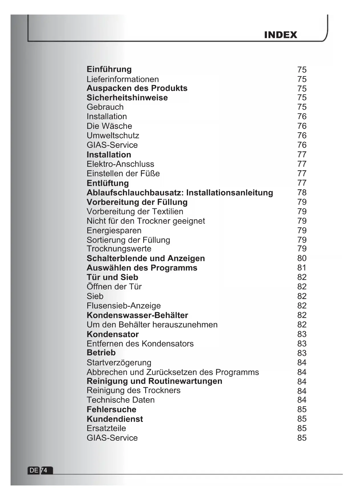 Mögliche Gründe für... Fehler, die Sie selbst beheben könnenPrüfen Sie alle Punkte in der folgenden Checkliste, bevor Sie sich an den GIAS-Service wenden. Sollte die Waschmaschine funktionstüchtig sein oder unsachgemäß installiert oder verwendet worden sein, wird Ihnen der Besuch des Kundendien-sttechnikers inRechnung gestellt. Wenn das Problem weiterhin besteht, nachdem Sie die Checkliste durchgegangen sind, wenden Sie sich bitte an den GIAS-Service, der Ihnen evtl. telefonisch weiterhelfen kann.Die Restzeitanzeige auf dem Display könnte sich während des Trocknungsgangs ändern. Die Restzeit wird kontinuierlich während der Trocknung überprüft und die Zeit wird angepasst, um eine bestmögliche Schätzung der Restdauer zu geben. Es ist daher ganz normal, dass die angezeigte Restzeit sich vergrößern oder verkleinern kannDie Trocknungszeit ist zu lang/die Textilien sind nicht trocken genug…Ⴠ Haben Sie die richtige Trocknungszeit/das richtige Programm gewählt?ჀWaren die Textilien zu nass? Wurden die Textilien sorgfältig ausgewrungen odergeschleudert?Ⴠ Muss das Sieb gereinigt werden?Ⴠ Muss der Kondensator gereinigt werden?Ⴠ Ist der Trockner überladen?ჀSind die Luftansaug- und Abluftanschlüsse sowiedie Fläche unter dem Sockel desTrockners frei?Ⴠ Ist die Taste noch von einem früher gewählten Programm gedrückt?Der Trockner funktioniert nicht…Ⴠ Ist der elektrische Netzanschluss für den Trockner in Ordnung? Kontrollieren Sie diesen mit einem anderen Gerät, wie z.B. einer Tischlampe.Ⴠ Befindet sich der Stecker korrekt in der Steckdose?Ⴠ Gibt es einen Stromausfall?Ⴠ Ist die Sicherung herausgesprungen?ჀIst die Tür richtig geschlossen?Ⴠ Ist der Trockner sowohl am Netzanschluss als auch an der Maschine angestellt?Ⴠ Ist die Trocknungszeit oder das Programm gewählt worden?Ⴠ Ist die Maschine nach dem Türöffnen wieder angestellt worden?ჀHat der Trockner den Betrieb eingestellt, weil der Kondenswasser-Behälter voll ist und entleert werden muss? Der Trockner ist zu laut…