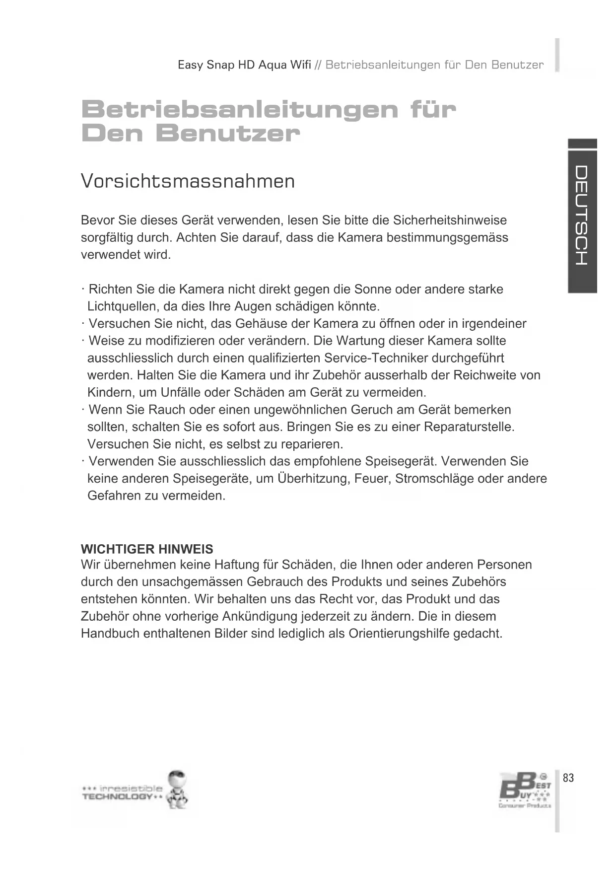 - Verwenden Sie ausschliesslich das empfohlene Speisegerät. Verwenden Sie keine anderen Speisegeräte, um Überhitzung, Feuer, Stromschläge oder andere Gefahren zu vermeiden. WICHTIGER HINWEIS Wir übernehmen keine Haftung für Schäden, die Ihnen oder anderen Personen durch den unsachgemässen Gebrauch des Produkts und seines Zubehörs entstehen könnten. Wir behalten uns das Recht vor, das Produkt und das Zubehör ohne vorherige Ankündigung jederzeit zu ändern. Die in diesem Handbuch enthaltenen Bilder sind lediglich als Orientierungshilfe gedacht.D E UT S C H Betriebsanleitungen für Den Benutzer // Easy Snap HD Aqua Wifi 84D E UT S C H Easy Snap HD Aqua Wifi // Betriebsanleitungen für Den Benutzer