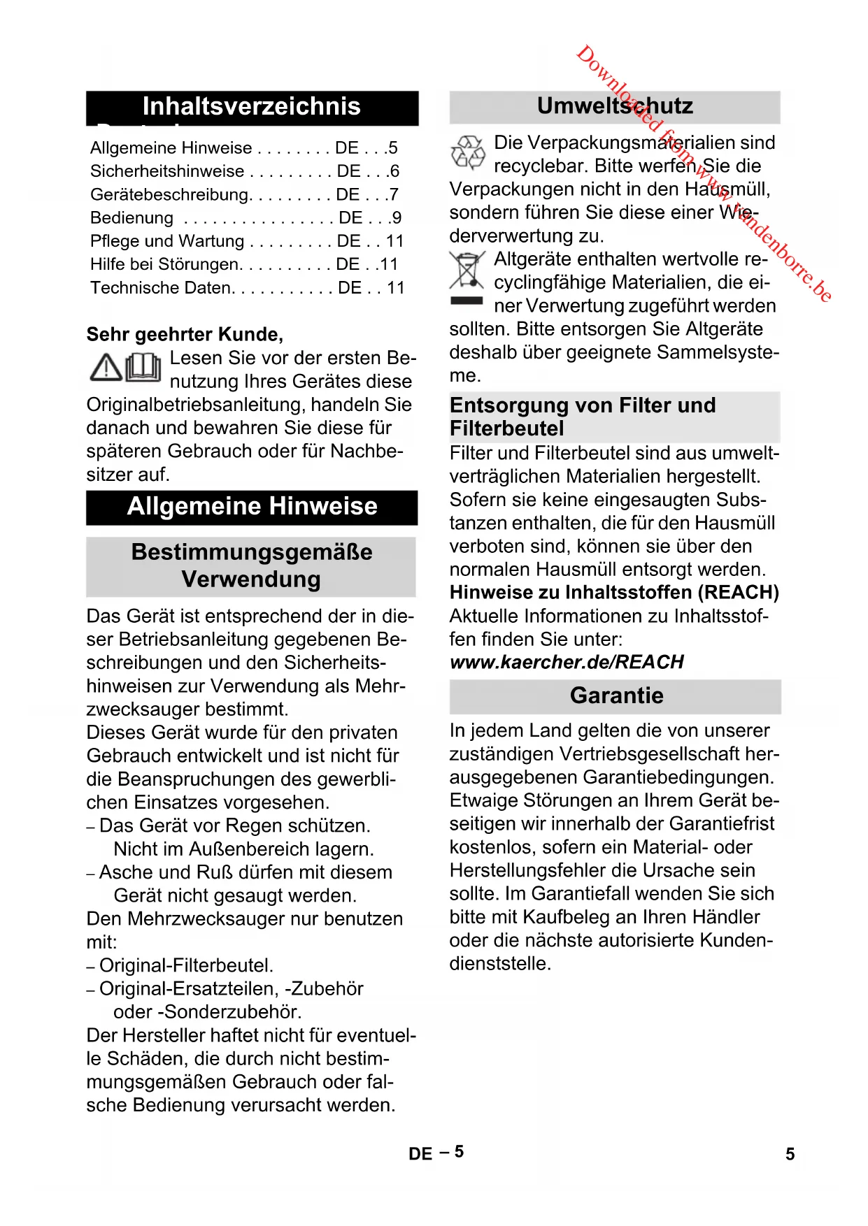 - Downloaded from www.vandenborre.beDeutsch – 5 Sehr geehrter Kunde, Lesen Sie vor der ersten Be- nutzung Ihres Gerätes diese Originalbetriebsanleitung, handeln Sie danach und bewahren Sie diese für späteren Gebrauch oder für Nachbe- sitzer auf. Das Gerät ist entsprechend der in die- ser Betriebsanleitung gegebenen Be- schreibungen und den Sicherheits- hinweisen zur Verwendung als Mehr- zwecksauger bestimmt. Dieses Gerät wurde für den privaten Gebrauch entwickelt und ist nicht für die Beanspruchungen des gewerbli- chen Einsatzes vorgesehen. – Das Gerät vor Regen schützen. Nicht im Außenbereich lagern. – Asche und Ruß dürfen mit diesem Gerät nicht gesaugt werden. Den Mehrzwecksauger nur benutzen mit: – Original-Filterbeutel.– Original-Ersatzteilen, -Zubehör oder -Sonderzubehör. Der Hersteller haftet nicht für eventuel- le Schäden, die durch nicht bestim- mungsgemäßen Gebrauch oder fal- sche Bedienung verursacht werden. Die Verpackungsmaterialien sind recyclebar. Bitte werfen Sie die Verpackungen nicht in den Hausmüll, sondern führen Sie diese einer Wie- derverwertung zu. Altgeräte enthalten wertvolle re- cyclingfähige Materialien, die ei- ner Verwertung zugeführt werden sollten. Bitte entsorgen Sie Altgeräte deshalb über geeignete Sammelsyste- me. Filter und Filterbeutel sind aus umwelt- verträglichen Materialien hergestellt. Sofern sie keine eingesaugten Subs- tanzen enthalten, die für den Hausmüll verboten sind, können sie über den normalen Hausmüll entsorgt werden. Hinweise zu Inhaltsstoffen (REACH) Aktuelle Informationen zu Inhaltsstof- fen finden Sie unter: www.kaercher.de/REACH In jedem Land gelten die von unserer zuständigen Vertriebsgesellschaft her- ausgegebenen Garantiebedingungen. Etwaige Störungen an Ihrem Gerät be- seitigen wir innerhalb der Garantiefrist kostenlos, sofern ein Material- oder Herstellungsfehler die Ursache sein sollte. Im Garantiefall wenden Sie sich bitte mit Kaufbeleg an Ihren Händler oder die nächste autorisierte Kunden- dienststelle. Inhaltsverzeichnis Allgemeine Hinweise