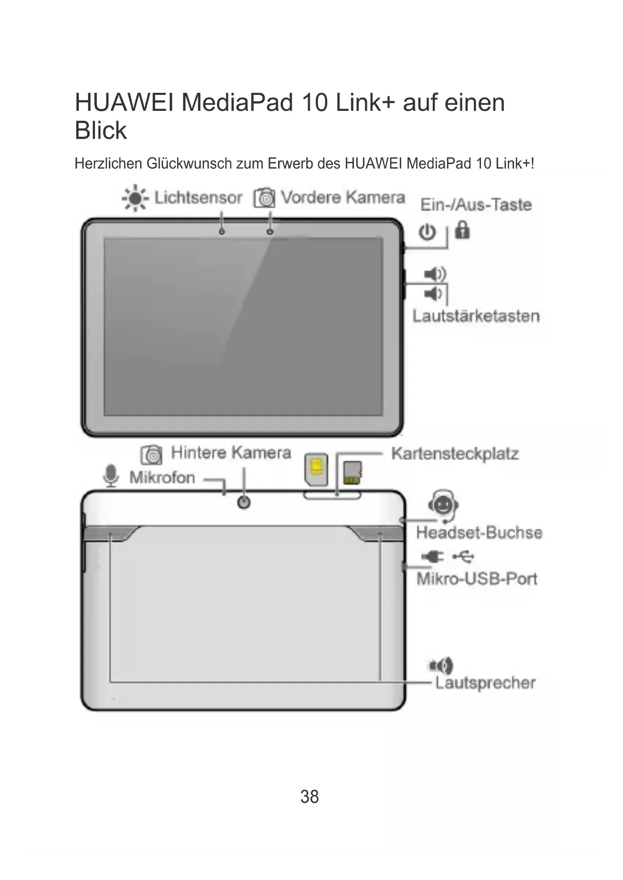 (Lieu) (Date) (Companystamp and legal signature)38 Herzlichen Glückwunsch zum Erwerb des HUAWEI MediaPad 10 Link+! HUAWEI MediaPad 10 Link+ auf einen Blick39 Halten Sie die Ein-/Aus-Taste gedrückt, um Ihr Gerät ein- bzw. auszuschalten oder es neu zu starten. Drücken Sie einmal die Ein-/Aus-Taste, um den Bildschirm ein- bzw. auszuschalten.