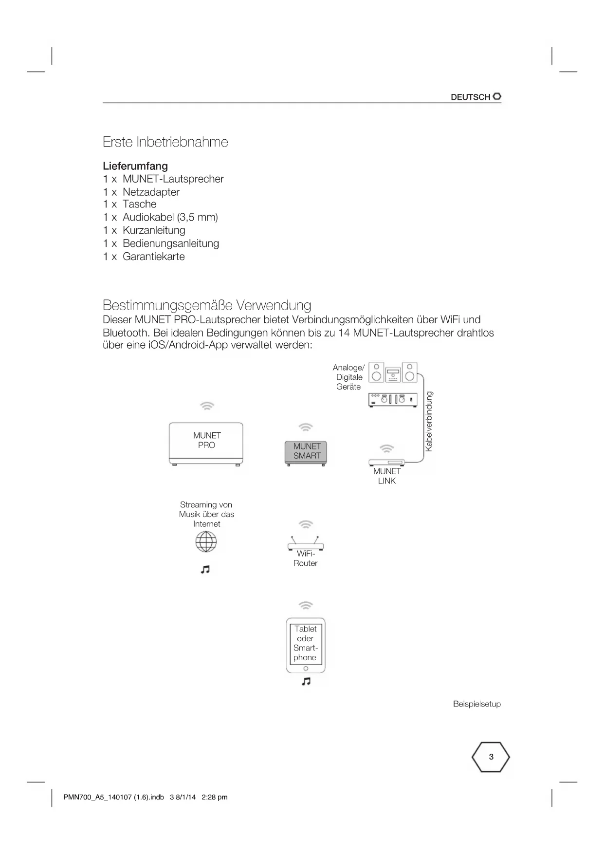 Erste Inbetriebnahme Lieferumfang 1 x MUNET-Lautsprecher 1 x Netzadapter 1 x Tasche 1 x Audiokabel (3,5 mm) 1 x Kurzanleitung 1 x Bedienungsanleitung 1 x Garantiekarte Bestimmungsgemäße Verwendung Dieser MUNET PRO-Lautsprecher bietet Verbindungsmöglichkeiten über WiFi und Bluetooth. Bei idealen Bedingungen können bis zu 14 MUNET-Lautsprecher drahtlos über eine iOS/Android-App verwaltet werden: Tablet oder Smart- phone MUNET SMART MUNET PRO MUNET LINK Analoge/ Digitale Geräte WiFi- Router Streaming von Musik über das Internet Kabelverbindung Beispielsetup PMN700_A5_140107 (1.6).indb 3 8/1/14 2:28 pmDEUTSCH