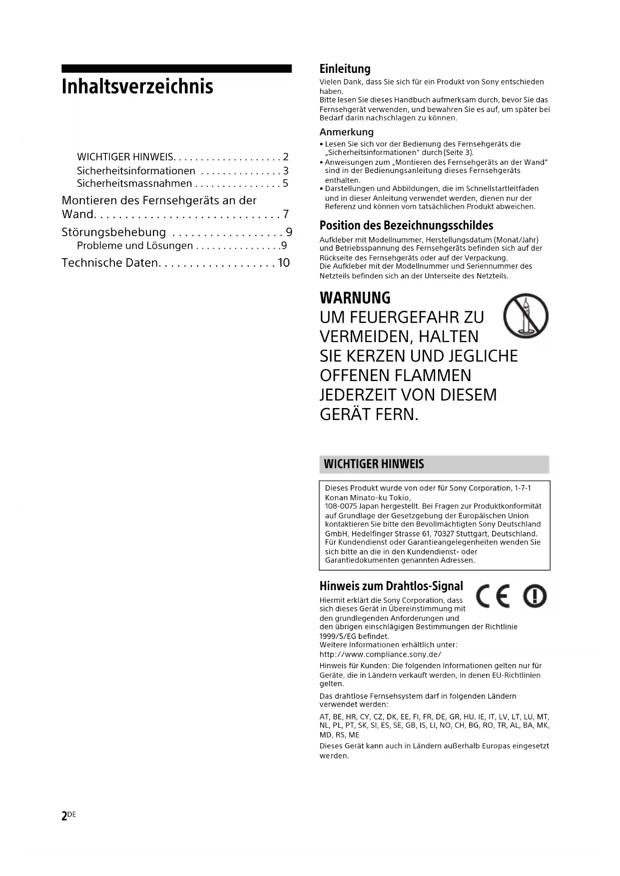 Hinweis zum Drahtlos-Signal Hiermit erklärt die Sony Corporation, dass sich dieses Gerät in Übereinstimmung mit den grundlegenden Anforderungen und den übrigen einschlägigen Bestimmungen der Richtlinie 1999/5/EG befindet. Weitere Informationen erhältlich unter: http://www.compliance.sony.de/Hinweis für Kunden: Die folgenden Informationen gelten nur für Geräte, die in Ländern verkauft werden, in denen EU-Richtlinien gelten.Das drahtlose Fernsehsystem darf in folgenden Ländern v erwendet werden:AT, BE, HR, CY, CZ, DK, EE, FI, FR, DE, GR, HU, IE, IT, LV, LT, LU, MT, NL, PL, PT, SK, SI, ES, SE, GB, IS, LI, NO, CH, BG, RO, TR, AL, BA, MK, MD, RS, MEDieses Gerät kann auch in Ländern außerhalb Europas eingesetzt we rden. WICHTIGER HINWEIS Dieses Produkt wurde von oder für Sony Corporation, 1-7-1 Konan Minato-ku Tokio, 108-0075 Japan hergestellt. Bei Fragen zur Produktkonformität a uf Grundlage der Gesetzgebung der Europäischen Union kontaktieren Sie bitte den Bevollmächtigten Sony Deutschland GmbH, Hedelfinger Strasse 61, 70327 Stuttgart, Deutschland. Für Kundendienst oder Garantieangelegenheiten wenden Sie sich bitte an die in den Kundendienst- oder Garantiedokumenten genannten Adressen.DE