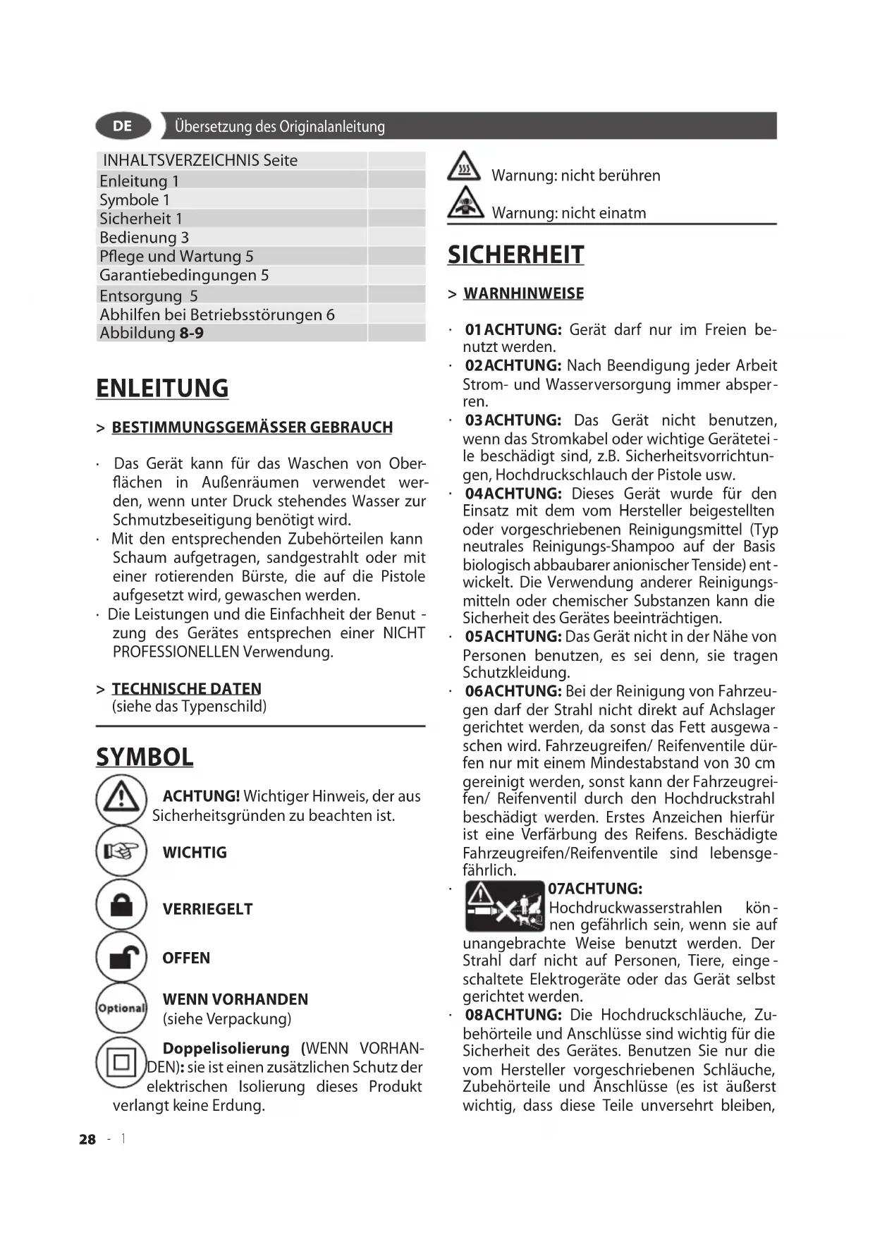 INHALTSVERZEICHNIS Seite Enleitung 1 Symbole 1 Sicherheit 1 Bedienung 3 Pflege und Wartung 5 Garantiebedingungen 5 Entsorgung 5 Abhilfen bei Betriebsstörungen 6 Abbildung 8-9 ENLEITUNG