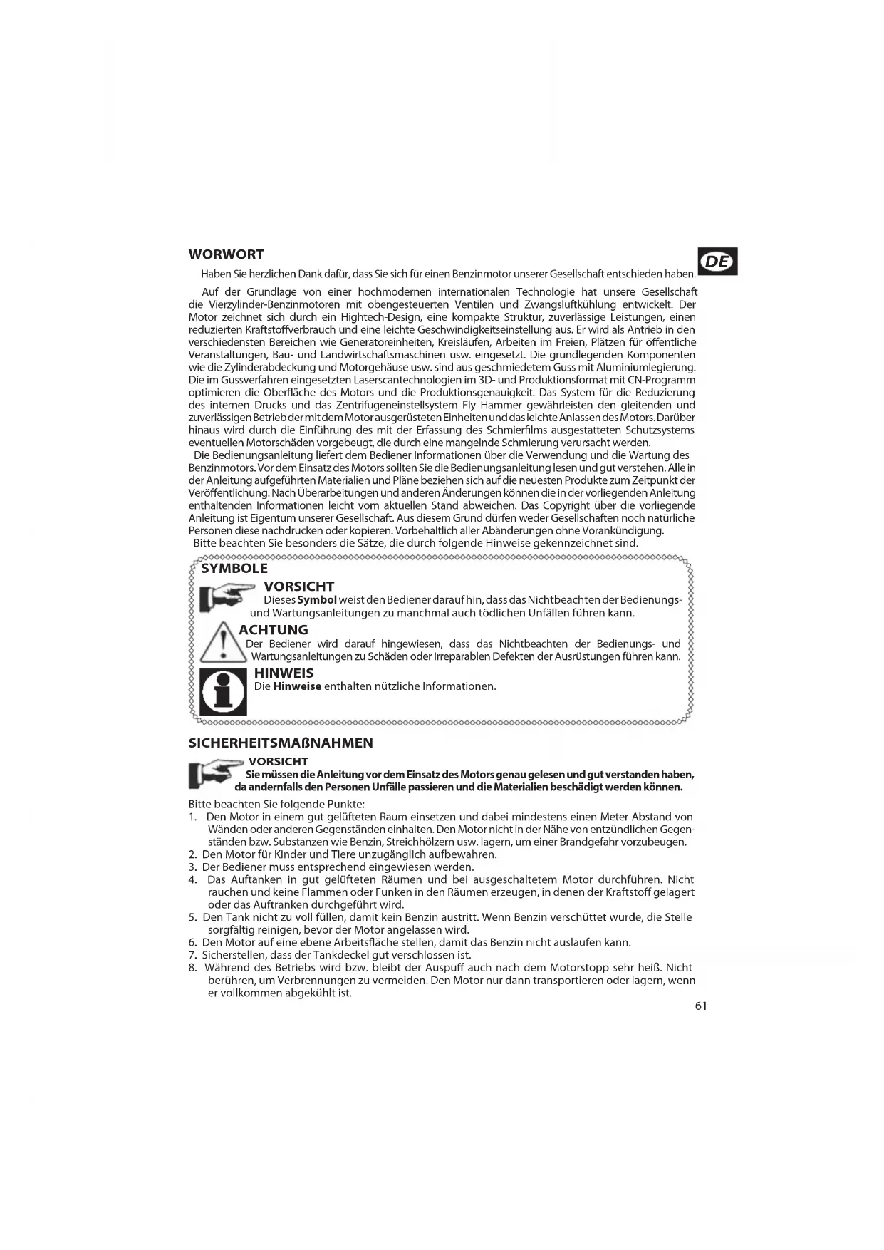B1 Noir Y Jaune G Vert61 WORWORT Haben Sie herzlichen Dank dafür, dass Sie sich für einen Benzinmotor unserer Gesellschaft entschieden haben. Auf der Grundlage von einer hochmodernen internationalen Technologie hat unsere Gesellschaft die Vierzylinder-Benzinmotoren mit obengesteuerten Ventilen und Zwangsluftkühlung entwickelt. Der Motor zeichnet sich durch ein Hightech-Design, eine kompakte Struktur, zuverlässige Leistungen, einen reduzierten Kraftstoffverbrauch und eine leichte Geschwindigkeitseinstellung aus. Er wird als Antrieb in den verschiedensten Bereichen wie Generatoreinheiten, Kreisläufen, Arbeiten im Freien, Plätzen für öffentliche Veranstaltungen, Bau- und Landwirtschaftsmaschinen usw. eingesetzt. Die grundlegenden Komponenten wie die Zylinderabdeckung und Motorgehäuse usw. sind aus geschmiedetem Guss mit Aluminiumlegierung. Die im Gussverfahren eingesetzten Laserscantechnologien im 3D- und Produktionsformat mit CN-Programm optimieren die Oberfläche des Motors und die Produktionsgenauigkeit. Das System für die Reduzierung des internen Drucks und das Zentrifugeneinstellsystem Fly Hammer gewährleisten den gleitenden und zuverlässigen Betrieb der mit dem Motor ausgerüsteten Einheiten und das leichte Anlassen des Motors. Darüber hinaus wird durch die Einführung des mit der Erfassung des Schmierfilms ausgestatteten Schutzsystems eventuellen Motorschäden vorgebeugt, die durch eine mangelnde Schmierung verursacht werden. Die Bedienungsanleitung liefert dem Bediener Informationen über die Verwendung und die Wartung des Benzinmotors. Vor dem Einsatz des Motors sollten Sie die Bedienungsanleitung lesen und gut verstehen. Alle in der Anleitung aufgeführten Materialien und Pläne beziehen sich auf die neuesten Produkte zum Zeitpunkt der Veröffentlichung. Nach Überarbeitungen und anderen Änderungen können die in der vorliegenden Anleitung enthaltenden Informationen leicht vom aktuellen Stand abweichen. Das Copyright über die vorliegende Anleitung ist Eigentum unserer Gesellschaft. Aus diesem Grund dürfen weder Gesellschaften noch natürliche Personen diese nachdrucken oder kopieren. Vorbehaltlich aller Abänderungen ohne Vorankündigung. Bitte beachten Sie besonders die Sätze, die durch folgende Hinweise gekennzeichnet sind. SYMBOLE VORSICHT Dieses Symbol weist den Bediener darauf hin, dass das Nichtbeachten der Bedienungs- und Wartungsanleitungen zu manchmal auch tödlichen Unfällen führen kann. ACHTUNG Der Bediener wird darauf hingewiesen, dass das Nichtbeachten der Bedienungs- und Wartungsanleitungen zu Schäden oder irreparablen Defekten der Ausrüstungen führen kann. HINWEIS Die Hinweise enthalten nützliche Informationen. SICHERHEITSMAßNAHMEN VORSICHT Sie müssen die Anleitung vor dem Einsatz des Motors genau gelesen und gut verstanden haben, da andernfalls den Personen Unfälle passieren und die Materialien beschädigt werden können. Bitte beachten Sie folgende Punkte: