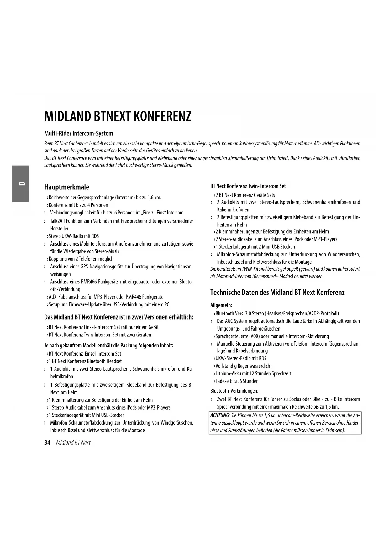 › Talk2All Funktion zum Verbinden mit Freisprecheinrichtungen verschiedener Hersteller › Stereo UKW-Radio mit RDS › Anschluss eines Mobiltelefons, um Anrufe anzunehmen und zu tätigen, sowie für die Wiedergabe von Stereo-Musik › Kopplung von 2 Telefonen möglich › Anschluss eines GPS-Navigationsgeräts zur Übertragung von Navigationsan- weisungen › Anschluss eines PMR466 Funkgeräts mit eingebauter oder externer Blueto- oth-Verbindung › AUX-Kabelanschluss für MP3-Player oder PMR446 Funkgeräte › Setup und Firmware-Update über USB-Verbindung mit einem PC Das Midland BT Next Konferenz ist in zwei Versionen erhältlich: › BT Next Konferenz Einzel-Intercom Set mit nur einem Gerät › BT Next Konferenz Twin-Intercom Set mit zwei GerätenJe nach gekauftem Modell enthält die Packung folgenden Inhalt: › BT Next Konferenz Einzel-Intercom Set › 1 BT Next Konferenz Bluetooth Headset › 1 Audiokit mit zwei Stereo-Lautsprechern, Schwanenhalsmikrofon und Ka- belmikrofon › 1 Befestigungsplatte mit zweiseitigem Klebeband zur Befestigung des BT Next am Helm › 1 Klemmhalterung zur Befestigung der Einheit am Helm › 1 Stereo-Audiokabel zum Anschluss eines iPods oder MP3-Players › 1 Steckerladegerät mit Mini USB-Stecker › Mikrofon-Schaumstoabdeckung zur Unterdrückung von Windgeräuschen, Inbusschlüssel und Klettverschluss für die MontageBT Next Konferenz Twin- Intercom Set › 2 BT Next Konferenz Geräte Sets › 2 Audiokits mit zwei Stereo-Lautsprechern, Schwanenhalsmikrofonen und Kabelmikrofonen › 2 Befestigungsplatten mit zweiseitigem Klebeband zur Befestigung der Ein- heiten am Helm › 2 Klemmhalterungen zur Befestigung der Einheiten am Helm › 2 Stereo-Audiokabel zum Anschluss eines iPods oder MP3-Players › 1 Steckerladegerät mit 2 Mini-USB Steckern › Mikrofon-Schaumstoabdeckung zur Unterdrückung von Windgeräuschen, Inbusschlüssel und Klettverschluss für die MontageDie Gerätesets im TWIN-Kit sind bereits gekoppelt (gepairt) und können daher sofort als Motorrad-Intercom (Gegensprech- Modus) benutzt werden. Technische Daten des Midland BT Next Konferenz Allgemein: › Bluetooth Vers. 3.0 Stereo (Headset/Freisprechen/A2DP-Protokoll) › Das AGC System regelt automatisch die Lautstärke in Abhängigkeit von den Umgebungs- und Fahrgeräuschen › Sprachgesteuerte (VOX) oder manuelle Intercom-Aktivierung › Manuelle Steuerung zum Aktivieren von: Telefon, Intercom (Gegensprechan- lage) und Kabelverbindung › UKW-Stereo-Radio mit RDS › Vollständig Regenwasserdicht › Lithium-Akku mit 12 Stunden Sprechzeit › Ladezeit: ca. 6 StundenBluetooth-Verbindungen: › Zwei BT Next Konferenz für Fahrer zu Sozius oder Bike - zu - Bike Intercom Sprechverbindung mit einer maximalen Reichweite bis zu 1,6 km. ACHTUNG: Sie können bis zu 1,6 km Intercom-Reichweite erreichen, wenn die An-