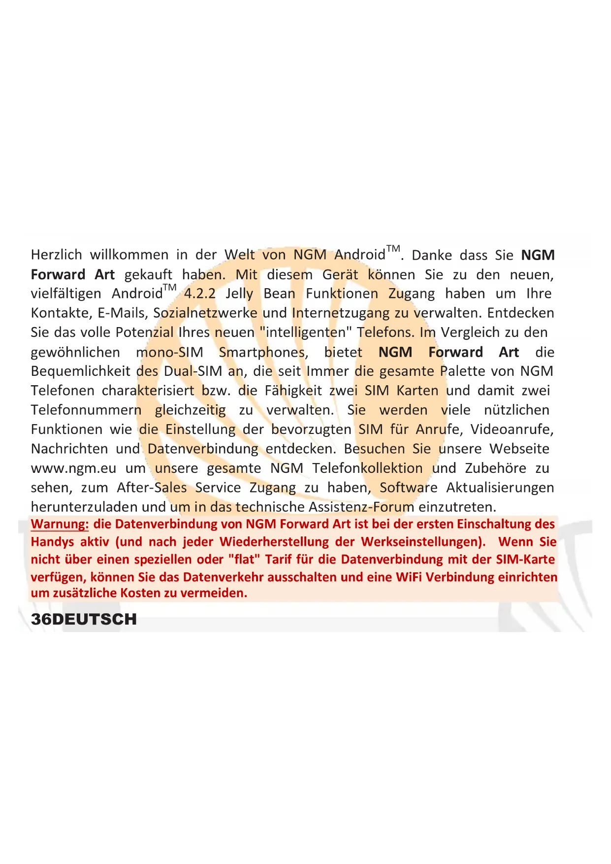 Hinweis: es können Klingeltöne in den Formaten *mid,*wav,*ogg und *Mp3 verwendet werden.47DEUTSCH SMS und MMS lesen und schreiben SMS und MMS lesen: wenn Sie ein neues SMS oder MMS empfangen, wird ein Icon in der Hinweistafel erscheinen. Mit einem Klick auf das Icon können Sie direkt das Gespräch öffnen und die eingehende Nachricht lesen. In jedem Fall können Sie auch durch das Nachrichten-Icon aus Hauptbildschirm-und Menü Ihre Nachrichten öffnen. SMS und MMS versenden Von Home oder aus dem Hauptmenü wählen Sie Nachrichten und dann das Icon. Geben Sie die ersten Buchstaben eines Namens in das Empfängerfeld ein und wählen Sie aus der Popup-Liste direkt die Nummer des Empfängers aus, oder wählen Sie das Kontakte-Icon und markieren Sie den/die Empfänger. Geben Sie den Text in das dedizierte Feld mit der virtuellen Tastatur ein. Wählen Sie das Icon um eventuelle Multimedia-Dateien einzufügen (die Nachricht wird automatisch in MMS verwandelt) und wählen Sie Versenden und SIM1 oder SIM2. KONNEKTIVITÄT: zur besseren Nutzung des Telefon-Potenzials und des Betriebssystems, müssen Sie über einer aktiven Datenverbindung verfügen; die Datenverbindung von NGM Forward Art ist zum Zeitpunkt der ersten Einschaltung auf dem Handy aktiv. Falls Ihr Telefonvertrag keine Datenverbindung enthält, könnten zusätzliche Kosten auftreten; es ist daher ratsam eine WiFi Internetverbindung zu konfigurieren. Um den Datenverkehr auf einer der SIM-Karten zu aktivieren, wählen Sie Einstellungen > SIM Verwaltung > Datenverbindung, oder aktivieren Sie es über die Abkürzung in der Hinweistafel.48 DEUTSCH Internetverbindung mit Wi-Fi® Funktion: Sie können sich mit einem WLAN Netzwerk dank der Wi-Fi Funktion Verbinden. Um es zu aktivieren, wählen Sie im Hauptmenü Einstellungen > Wi-Fi. Folgen Sie immer allen Hinweisen und Warnungen wenn Sie sich in solchen Bereichen befinden, in denen der Gebrauch von Wireless Geräten verboten ist, sowie zum Beispiel auf Flugzeugen oder in Krankenhäusern usw. Stellen Sie das WiFi in diesen Bereichen aus. Verbindung zu einem Bluetooth® Gerät: schalten Sie das Bluetooth-Gerät ein, das Sie anschließen möchten. Folgen Sie eventuell die Anleitungen des Gerätes. Aus dem Hauptmenü wählen Sie Einstellungen > Bluetooth ein/aus um Bluetooth einzuschalten. Im Kontextmenü finden Sie zusätzliche Funktionen und Einstellungen. Wählen Sie dann um die Suche nach neuen Bluetooth Geräten zu starten. Wählen Sie das gewünschte Gerät aus und wählen Sie „Koppeln“. Das Telefon wird versuchen, sich zu verbinden, eventuell wird ein Kopplungscode verlangt. Verbinden mit dem Internet: Aus dem Hauptmenü, wählen Sie Browser. Wählen Sie die URL in die Adressenbarre ein um die Navigation zu beginnen. Wenn Sie mit dem Telefondaten-Netzwerk navigieren, informieren Sie sich über die Kosten bei Ihrem Netzbetreiber oder wählen Sie eine so genannte "flat" Daten-Tarife. Ansonsten können Sie sich mit WiFi ans Internet verbinden (siehe „Konnektivität“).49DEUTSCH Konto konfigurieren: um besser alle Funktionen des Android