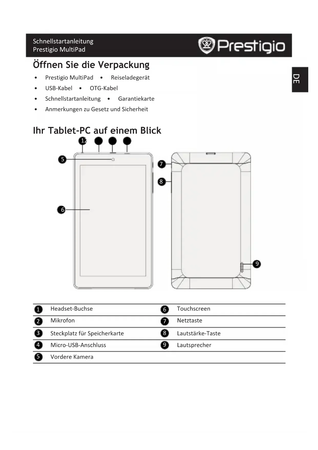 VordereKameraDE Schnellstartanleitung Prestigio MultiPad Tasten Taste Definition Funktion Netztaste