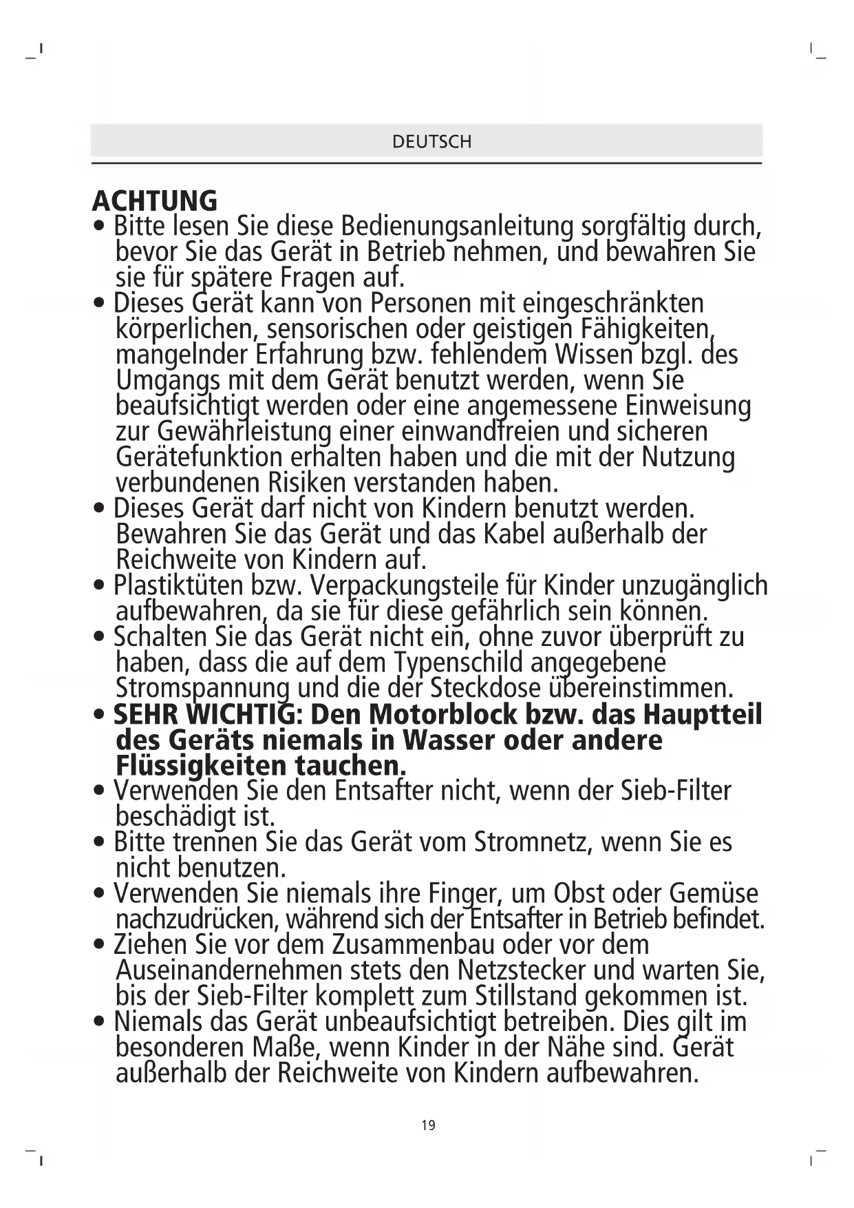 - SEHR WICHTIG: Den Motorblock bzw. das Hauptteil des Geräts niemals in Wasser oder andere Flüssigkeiten tauchen.