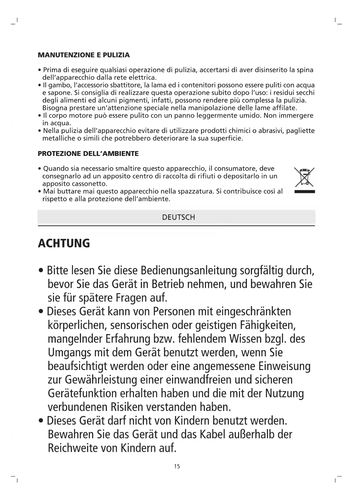 - Dieses Gerät wurde für den exklusiven, häuslichen Gebrauch konzipiert. Das Gerät sollte ununterbrochen nicht länger als 30 Sekunden am Stück und im Intervallbetrieb nicht länger als 1 Minute betrieben werden. Lassen Sie das Gerät nach diesem Zeitraum für einige Minuten abkühlen, ehe Sie es erneut benutzen.