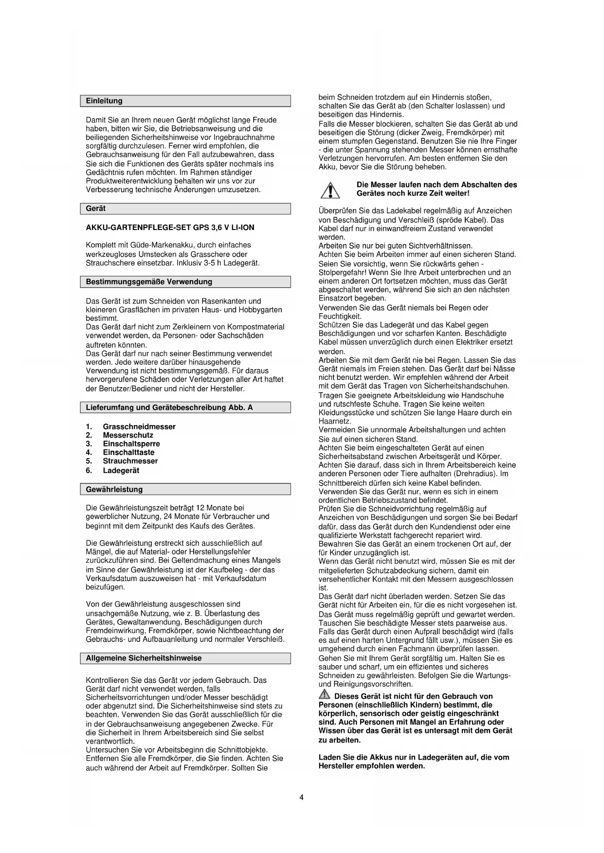 Gewährleistung Die Gewährleistungszeit beträgt 12 Monate bei gewerblicher Nutzung, 24 Monate für Verbraucher und beginnt mit dem Zeitpunkt des Kaufs des Gerätes. Die Gewährleistung erstreckt sich ausschließlich auf Mängel, die auf Material- oder Herstellungsfehler zurückzuführen sind. Bei Geltendmachung eines Mangels im Sinne der Gewährleistung ist der Kaufbeleg - der das Verkaufsdatum auszuweisen hat - mit Verkaufsdatum beizufügen. Von der Gewährleistung ausgeschlossen sind unsachgemäße Nutzung, wie z. B. Überlastung des Gerätes, Gewaltanwendung, Beschädigungen durch Fremdeinwirkung, Fremdkörper, sowie Nichtbeachtung der Gebrauchs- und Aufbauanleitung und normaler Verschleiß. Allgemeine Sicherheitshinweise Kontrollieren Sie das Gerät vor jedem Gebrauch. Das Gerät darf nicht verwendet werden, falls Sicherheitsvorrichtungen und/oder Messer beschädigt oder abgenutzt sind. Die Sicherheitshinweise sind stets zu beachten. Verwenden Sie das Gerät ausschließlich für die in der Gebrauchsanweisung angegebenen Zwecke. Für die Sicherheit in Ihrem Arbeitsbereich sind Sie selbst verantwortlich. Untersuchen Sie vor Arbeitsbeginn die Schnittobjekte. Entfernen Sie alle Fremdkörper, die Sie finden. Achten Sie auch während der Arbeit auf Fremdkörper. Sollten Sie beim Schneiden trotzdem auf ein Hindernis stoßen, schalten Sie das Gerät ab (den Schalter loslassen) und beseitigen das Hindernis. Falls die Messer blockieren, schalten Sie das Gerät ab und beseitigen die Störung (dicker Zweig, Fremdkörper) mit einem stumpfen Gegenstand. Benutzen Sie nie Ihre Finger - die unter Spannung stehenden Messer können ernsthafte Verletzungen hervorrufen. Am besten entfernen Sie den Akku, bevor Sie die Störung beheben. Die Messer laufen nach dem Abschalten des Gerätes noch kurze Zeit weiter! Überprüfen Sie das Ladekabel regelmäßig auf Anzeichen von Beschädigung und Verschleiß (spröde Kabel). Das Kabel darf nur in einwandfreiem Zustand verwendet werden. Arbeiten Sie nur bei guten Sichtverhältnissen. Achten Sie beim Arbeiten immer auf einen sicheren Stand. Seien Sie vorsichtig, wenn Sie rückwärts gehen - Stolpergefahr! Wenn Sie Ihre Arbeit unterbrechen und an einem anderen Ort fortsetzen möchten, muss das Gerät abgeschaltet werden, während Sie sich an den nächsten Einsatzort begeben. Verwenden Sie das Gerät niemals bei Regen oder Feuchtigkeit. Schützen Sie das Ladegerät und das Kabel gegen Beschädigungen und vor scharfen Kanten. Beschädigte Kabel müssen unverzüglich durch einen Elektriker ersetzt werden. Arbeiten Sie mit dem Gerät nie bei Regen. Lassen Sie das Gerät niemals im Freien stehen. Das Gerät darf bei Nässe nicht benutzt werden. Wir empfehlen während der Arbeit mit dem Gerät das Tragen von Sicherheitshandschuhen. Tragen Sie geeignete Arbeitskleidung wie Handschuhe und rutschfeste Schuhe. Tragen Sie keine weiten Kleidungsstücke und schützen Sie lange Haare durch ein Haarnetz. Vermeiden Sie unnormale Arbeitshaltungen und achten Sie auf einen sicheren Stand. Achten Sie beim eingeschalteten Gerät auf einen Sicherheitsabstand zwischen Arbeitsgerät und Körper. Achten Sie darauf, dass sich in Ihrem Arbeitsbereich keine anderen Personen oder Tiere aufhalten (Drehradius). Im Schnittbereich dürfen sich keine Kabel befinden. Verwenden Sie das Gerät nur, wenn es sich in einem ordentlichen Betriebszustand befindet. Prüfen Sie die Schneidvorrichtung regelmäßig auf Anzeichen von Beschädigungen und sorgen Sie bei Bedarf dafür, dass das Gerät durch den Kundendienst oder eine qualifizierte Werkstatt fachgerecht repariert wird. Bewahren Sie das Gerät an einem trockenen Ort auf, der für Kinder unzugänglich ist. Wenn das Gerät nicht benutzt wird, müssen Sie es mit der mitgelieferten Schutzabdeckung sichern, damit ein versehentlicher Kontakt mit den Messern ausgeschlossen ist. Das Gerät darf nicht überladen werden. Setzen Sie das Gerät nicht für Arbeiten ein, für die es nicht vorgesehen ist. Das Gerät muss regelmäßig geprüft und gewartet werden. Tauschen Sie beschädigte Messer stets paarweise aus. Falls das Gerät durch einen Aufprall beschädigt wird (falls es auf einen harten Untergrund fällt usw.), müssen Sie es umgehend durch einen Fachmann überprüfen lassen. Gehen Sie mit Ihrem Gerät sorgfältig um. Halten Sie es sauber und scharf, um ein effizientes und sicheres Schneiden zu gewährleisten. Befolgen Sie die Wartungs- und Reinigungsvorschriften. Dieses Gerät ist nicht für den Gebrauch von Personen (einschließlich Kindern) bestimmt, die körperlich, sensorisch oder geistig eingeschränkt sind. Auch Personen mit Mangel an Erfahrung oder Wissen über das Gerät ist es untersagt mit dem Gerät zu arbeiten. Laden Sie die Akkus nur in Ladegeräten auf, die vom Hersteller empfohlen werden. 4Für ein Ladegerät, das für eine bestimmte Art von Akkus geeignet ist, besteht Brandgefahr, wenn es mit anderen Akkus verwendet wird. Verwenden Sie nur die dafür vorgesehenen Akkus in den Elektrowerkzeugen. Halten Sie den nicht benutzten Akku fern von Büroklammern, Münzen, Schlüsseln, Nägeln, Schrauben oder anderen kleinen Metallgegenständen, die eine Überbrückung der Kontakte verursachen könnten. Ein Kurzschluss zwischen den Akkukontakten kann Verbrennungen oder Feuer zur Folge haben. Bei falscher Anwendung kann Flüssigkeit aus dem Akku austreten. Vermeiden Sie den Kontakt damit. Bei zufälligem Kontakt, mit Wasser abspülen. Wenn die Flüssigkeit in die Augen gelangt, nehmen Sie zusätzlich ärztliche Hilfe in Anspruch. Austretende Akkuflüssigkeit kann zu Hautreizungen führen. Elektrische Sicherheit GEFAHR! Stromschlag! Es besteht Verletzungsgefahr durch elektrischen Strom! Bei Beheben von Störungen und vor der Wartung den Netzstecker ziehen. Nur an Anschlüssen mit Fehlerstromschalter (RCD) betreiben! Bitte fragen Sie eine Elektrofachkraft. Die Angaben auf dem Typschild müssen mit den Daten des Stromnetzes übereinstimmen. Das Kabel vo