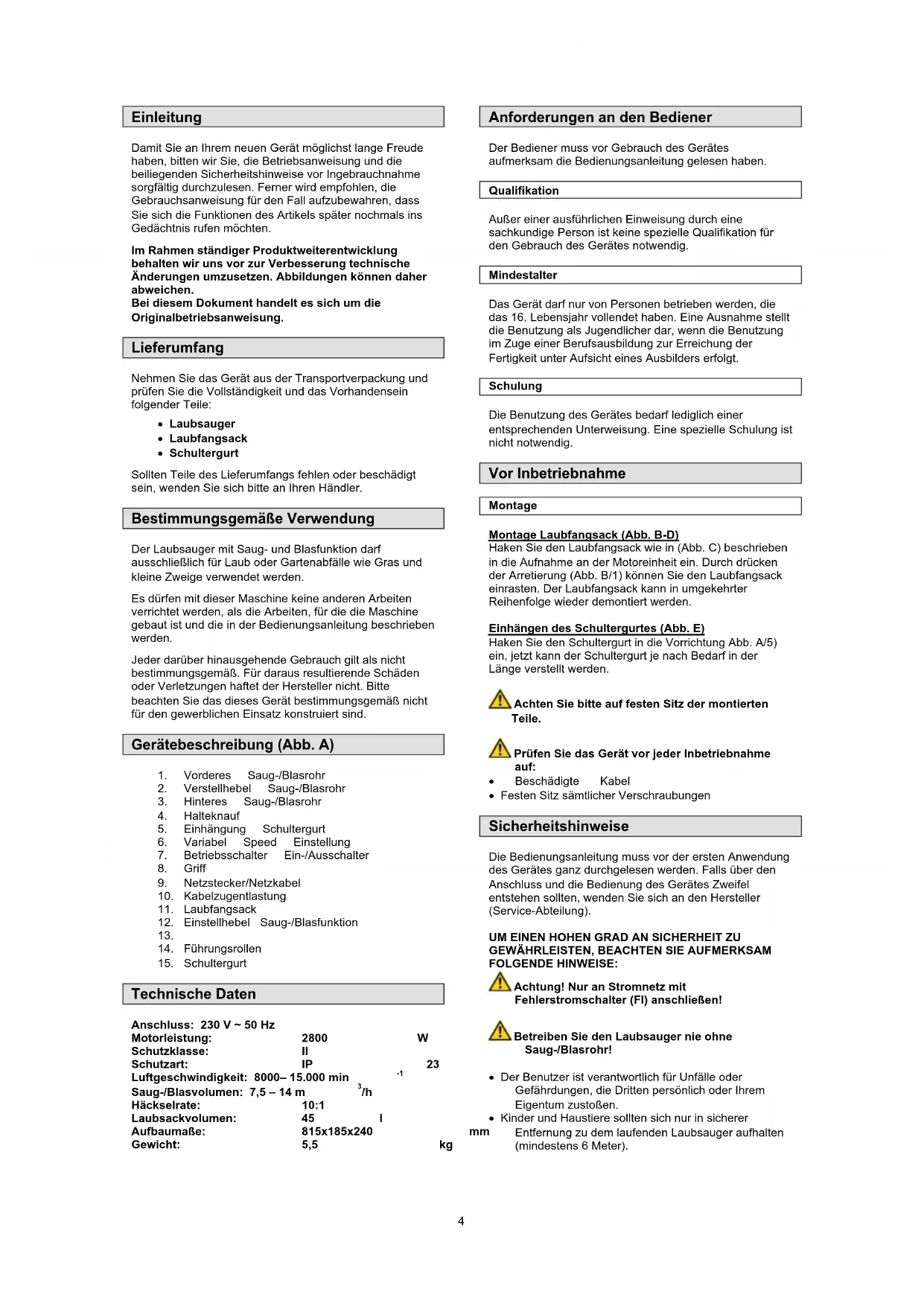 Anforderungen an den Bediener Der Bediener muss vor Gebrauch des Gerätes aufmerksam die Bedienungsanleitung gelesen haben. Qualifikation Außer einer ausführlichen Einweisung durch eine sachkundige Person ist keine spezielle Qualifikation für den Gebrauch des Gerätes notwendig. Mindestalter Das Gerät darf nur von Personen betrieben werden, die das 16. Lebensjahr vollendet haben. Eine Ausnahme stellt die Benutzung als Jugendlicher dar, wenn die Benutzung im Zuge einer Berufsausbildung zur Erreichung der Fertigkeit unter Aufsicht eines Ausbilders erfolgt. Schulung Die Benutzung des Gerätes bedarf lediglich einer entsprechenden Unterweisung. Eine spezielle Schulung ist nicht notwendig. Vor Inbetriebnahme Montage Montage Laubfangsack (Abb. B-D) Haken Sie den Laubfangsack wie in (Abb. C) beschrieben in die Aufnahme an der Motoreinheit ein. Durch drücken der Arretierung (Abb. B/1) können Sie den Laubfangsack einrasten. Der Laubfangsack kann in umgekehrter Reihenfolge wieder demontiert werden. Einhängen des Schultergurtes (Abb. E) Haken Sie den Schultergurt in die Vorrichtung Abb. A/5) ein, jetzt kann der Schultergurt je nach Bedarf in der Länge verstellt werden. Achten Sie bitte auf festen Sitz der montierten Teile. Prüfen Sie das Gerät vor jeder Inbetriebnahme auf: Beschädigte Kabel Festen Sitz sämtlicher Verschraubungen Sicherheitshinweise Die Bedienungsanleitung muss vor der ersten Anwendung des Gerätes ganz durchgelesen werden. Falls über den Anschluss und die Bedienung des Gerätes Zweifel entstehen sollten, wenden Sie sich an den Hersteller (Service-Abteilung). UM EINEN HOHEN GRAD AN SICHERHEIT ZU