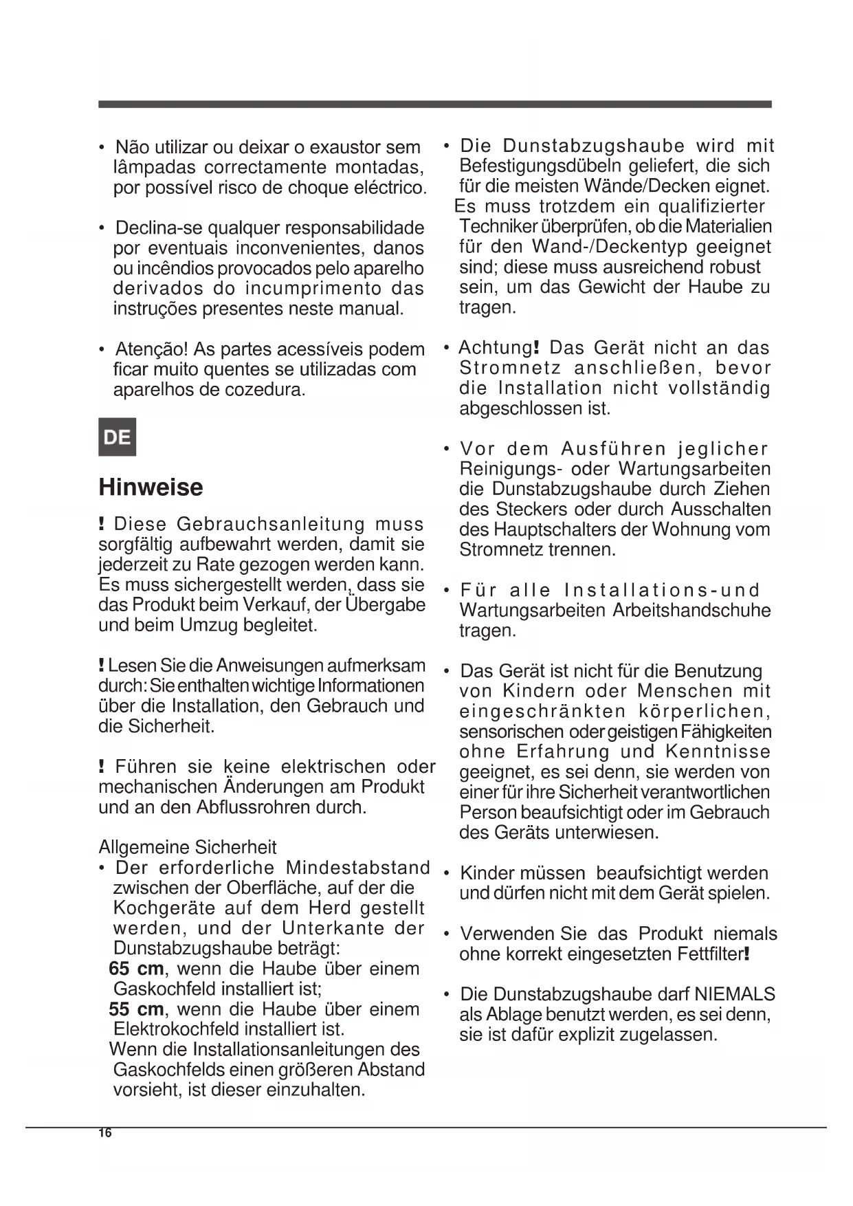 • Die Dunstabzugshaube darf NIEMALS