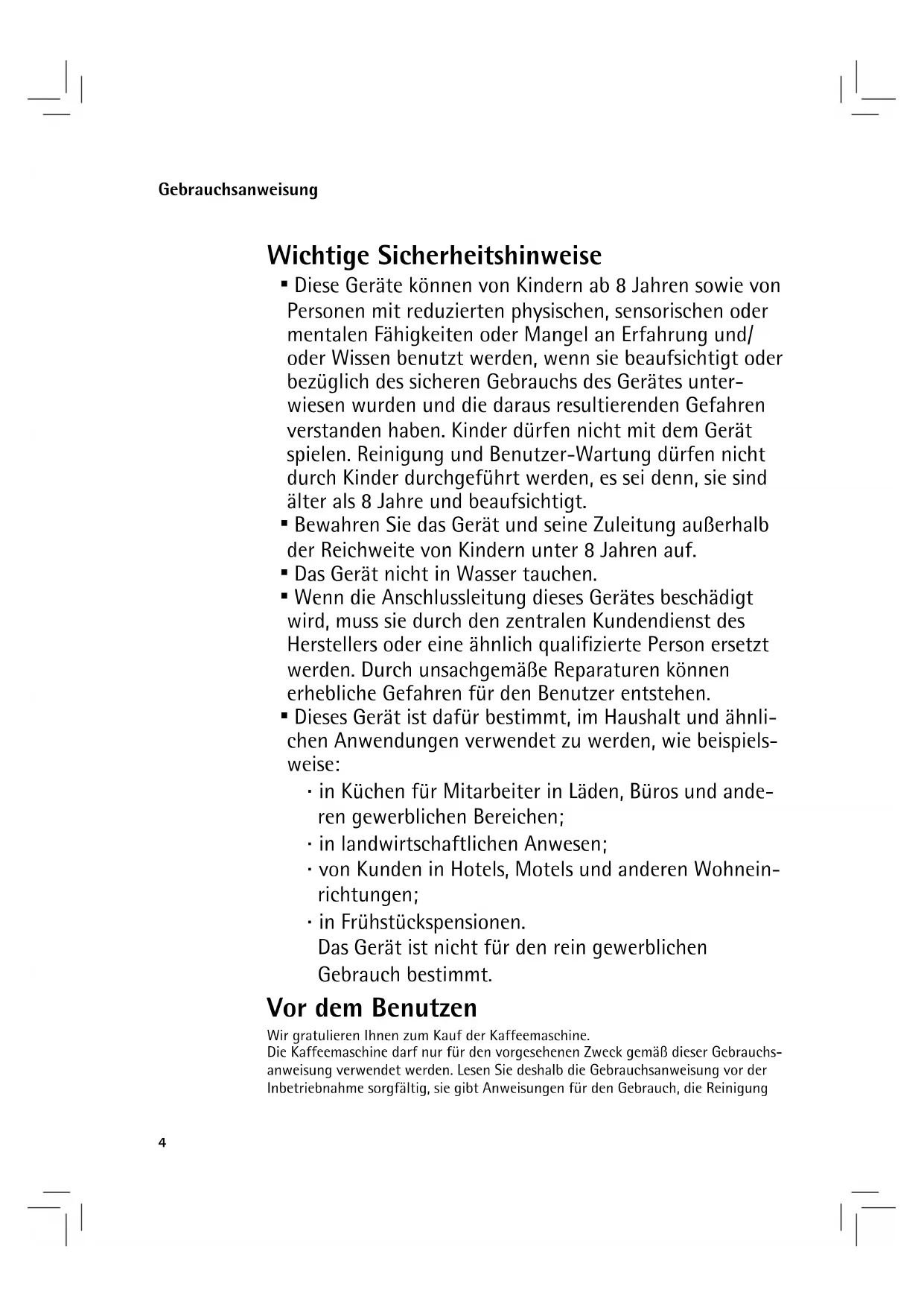 - Dieses Gerät ist dafür bestimmt, im Haushalt und ähnli- chen Anwendungen verwendet zu werden, wie beispiels- weise: ⋅ in Küchen für Mitarbeiter in Läden, Büros und ande- ren gewerblichen Bereichen; ⋅ in landwirtschaftlichen Anwesen; ⋅ von Kunden in Hotels, Motels und anderen Wohnein- richtungen; ⋅ in Frühstückspensionen. Das Gerät ist nicht für den rein gewerblichen Gebrauch bestimmt. Vor dem Benutzen Wir gratulieren Ihnen zum Kauf der Kaffeemaschine. Die Kaffeemaschine darf nur für den vorgesehenen Zweck gemäß dieser Gebrauchs- anweisung verwendet werden. Lesen Sie deshalb die Gebrauchsanweisung vor der Inbetriebnahme sorgfältig, sie gibt Anweisungen für den Gebrauch, die Reinigung Gebrauchsanweisung5