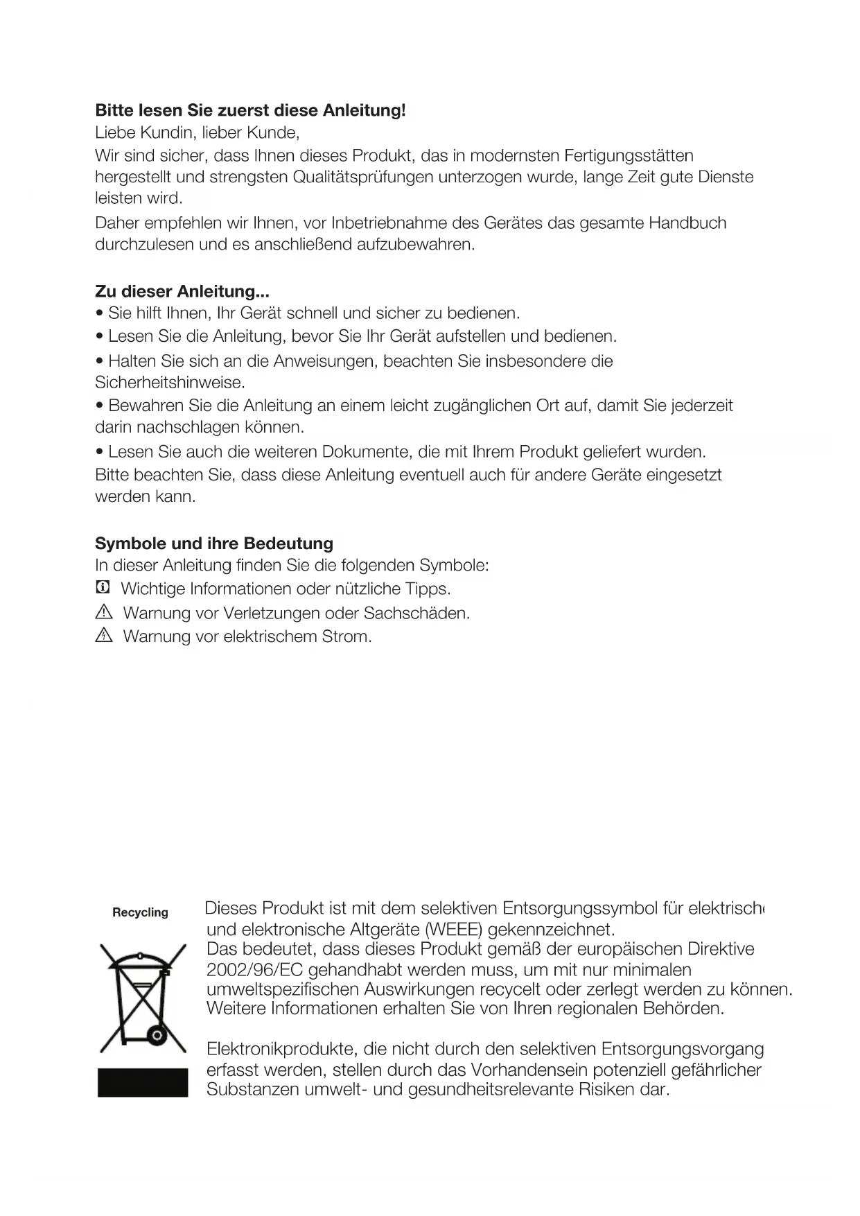 Daher empfehlen wir Ihnen, vor Inbetriebnahme des Gerätes das gesamte Handbuch
