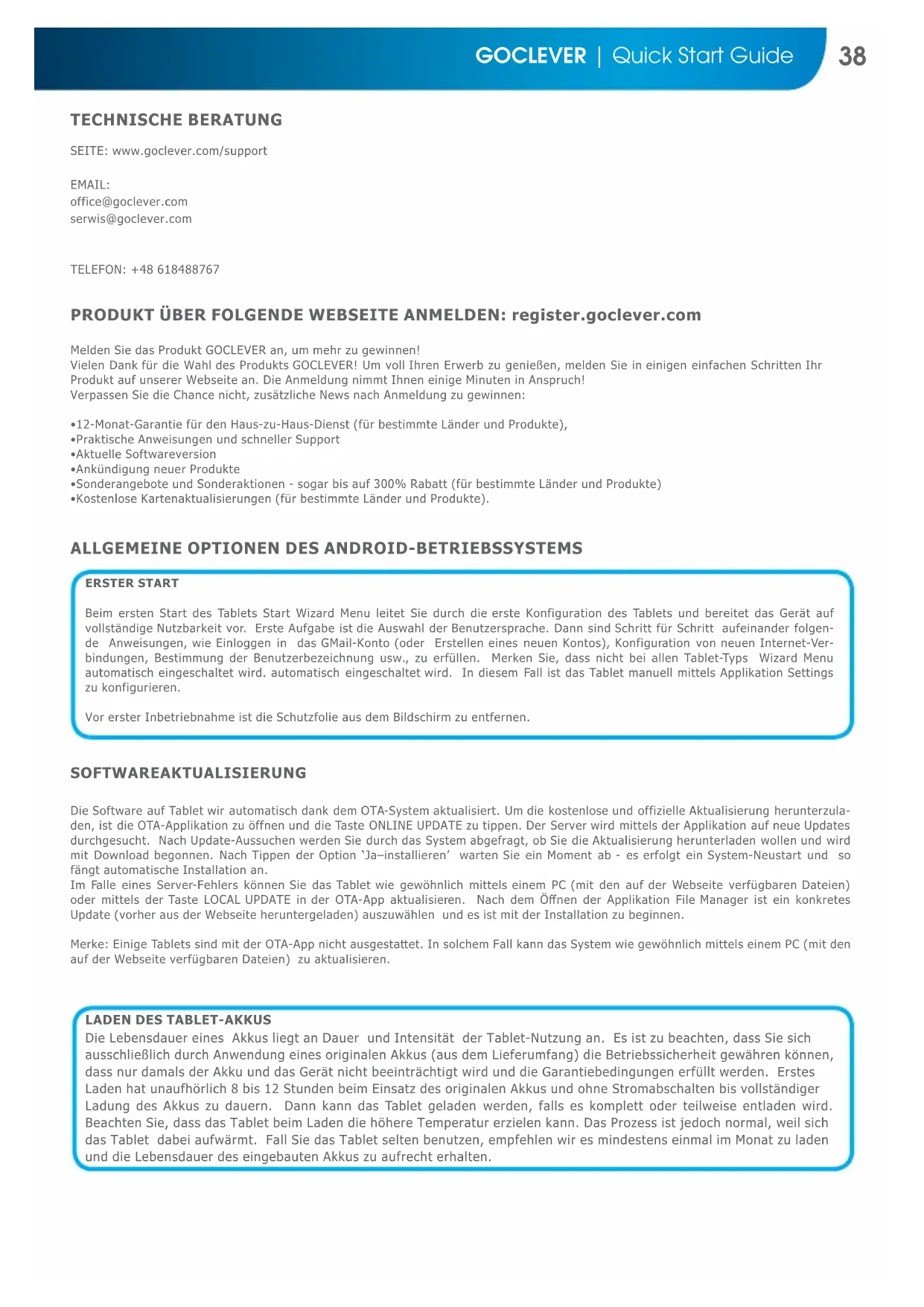 ERSTER START Beim ersten Start des Tablets Start Wizard Menu leitet Sie durch die erste Konfiguration des Tablets und bereitet das Gerät auf vollständige Nutzbarkeit vor. Erste Aufgabe ist die Auswahl der Benutzersprache. Dann sind Schritt für Schritt aufeinander folgen- de Anweisungen, wie Einloggen in das GMail-Konto (oder Erstellen eines neuen Kontos), Konfiguration von neuen Internet-Ver- bindungen, Bestimmung der Benutzerbezeichnung usw., zu erfüllen. Merken Sie, dass nicht bei allen Tablet-Typs Wizard Menu automatisch eingeschaltet wird. automatisch eingeschaltet wird. In diesem Fall ist das Tablet manuell mittels Applikation Settings zu konfigurieren.Vor erster Inbetriebnahme ist die Schutzfolie aus dem Bildschirm zu entfernen. PRODUKT ÜBER FOLGENDE WEBSEITE ANMELDEN: register.goclever.com Melden Sie das Produkt GOCLEVER an, um mehr zu gewinnen! Vielen Dank für die Wahl des Produkts GOCLEVER! Um voll Ihren Erwerb zu genießen, melden Sie in einigen einfachen Schritten Ihr Produkt auf unserer Webseite an. Die Anmeldung nimmt Ihnen einige Minuten in Anspruch! Verpassen Sie die Chance nicht, zusätzliche News nach Anmeldung zu gewinnen:•12-Monat-Garantie für den Haus-zu-Haus-Dienst (für bestimmte Länder und Produkte),•Praktische Anweisungen und schneller Support•Aktuelle Softwareversion•Ankündigung neuer Produkte•Sonderangebote und Sonderaktionen - sogar bis auf 300% Rabatt (für bestimmte Länder und Produkte)•Kostenlose Kartenaktualisierungen (für bestimmte Länder und Produkte). SOFTWAREAKTUALISIERUNG Die Software auf Tablet wir automatisch dank dem OTA-System aktualisiert. Um die kostenlose und offizielle Aktualisierung herunterzula- den, ist die OTA-Applikation zu öffnen und die Taste ONLINE UPDATE zu tippen. Der Server wird mittels der Applikation auf neue Updates durchgesucht. Nach Update-Aussuchen werden Sie durch das System abgefragt, ob Sie die Aktualisierung herunterladen wollen und wird mit Download begonnen. Nach Tippen der Option ‘Ja–installieren’ warten Sie ein Moment ab - es erfolgt ein System-Neustart und so fängt automatische Installation an. Im Falle eines Server-Fehlers können Sie das Tablet wie gewöhnlich mittels einem PC (mit den auf der Webseite verfügbaren Dateien) oder mittels der Taste LOCAL UPDATE in der OTA-App aktualisieren. Nach dem Öffnen der Applikation File Manager ist ein konkretes Update (vorher aus der Webseite heruntergeladen) auszuwählen und es ist mit der Installation zu beginnen. Merke: Einige Tablets sind mit der OTA-App nicht ausgestattet. In solchem Fall kann das System wie gewöhnlich mittels einem PC (mit den auf der Webseite verfügbaren Dateien) zu aktualisieren.