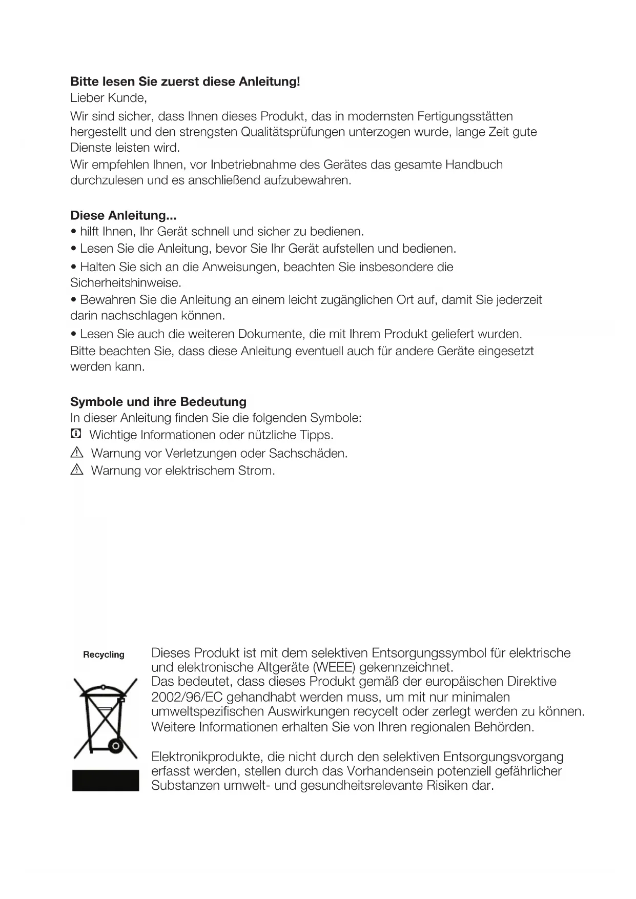 Wir empfehlen Ihnen, vor Inbetriebnahme des Gerätes das gesamte Handbuch